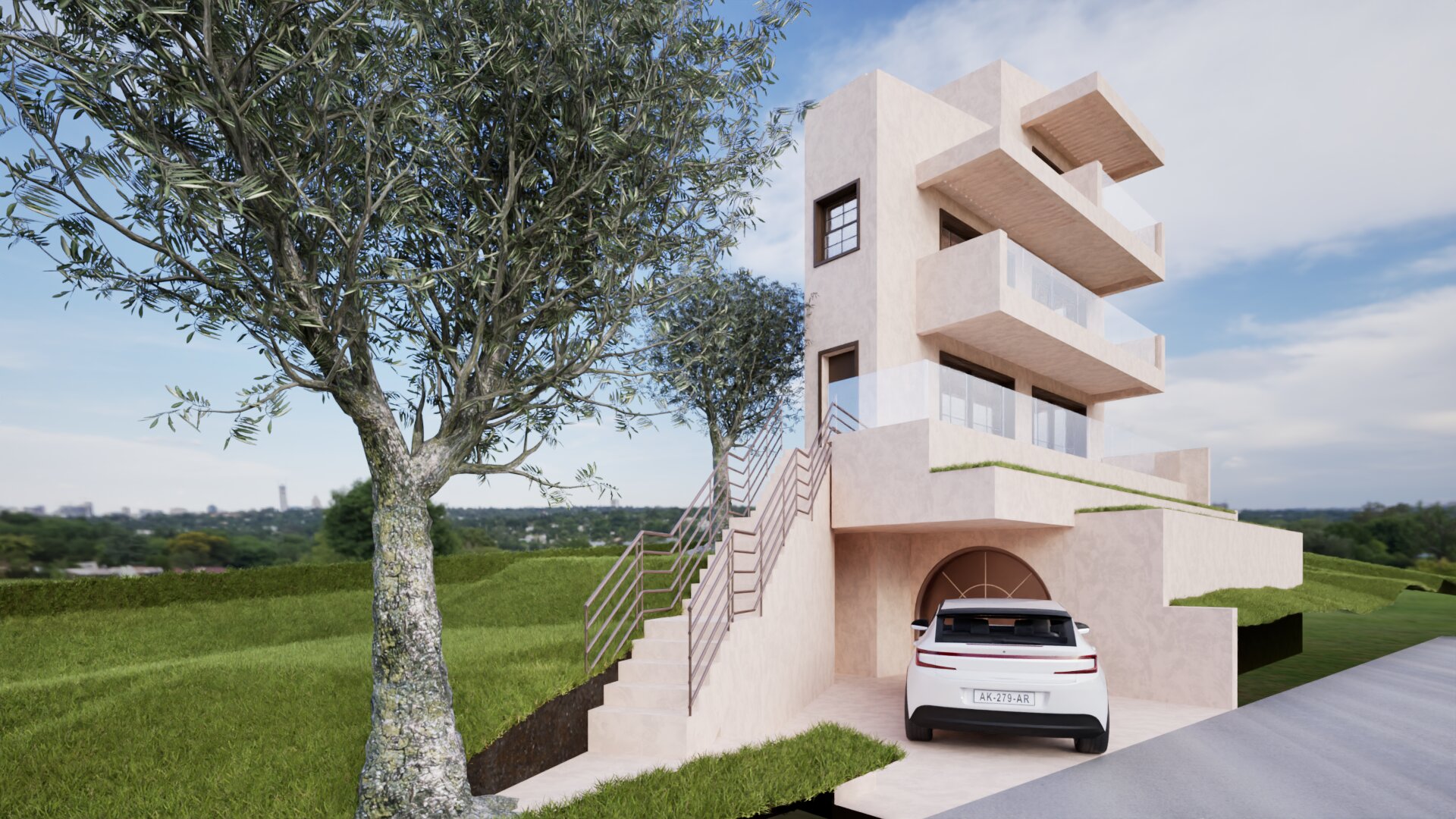 make it realistic add two people on the balconies add curtains behind the windows add short mediterranean vegetation on the grass add outdoor furniture on the balconies don t add vegetation on the first balcony