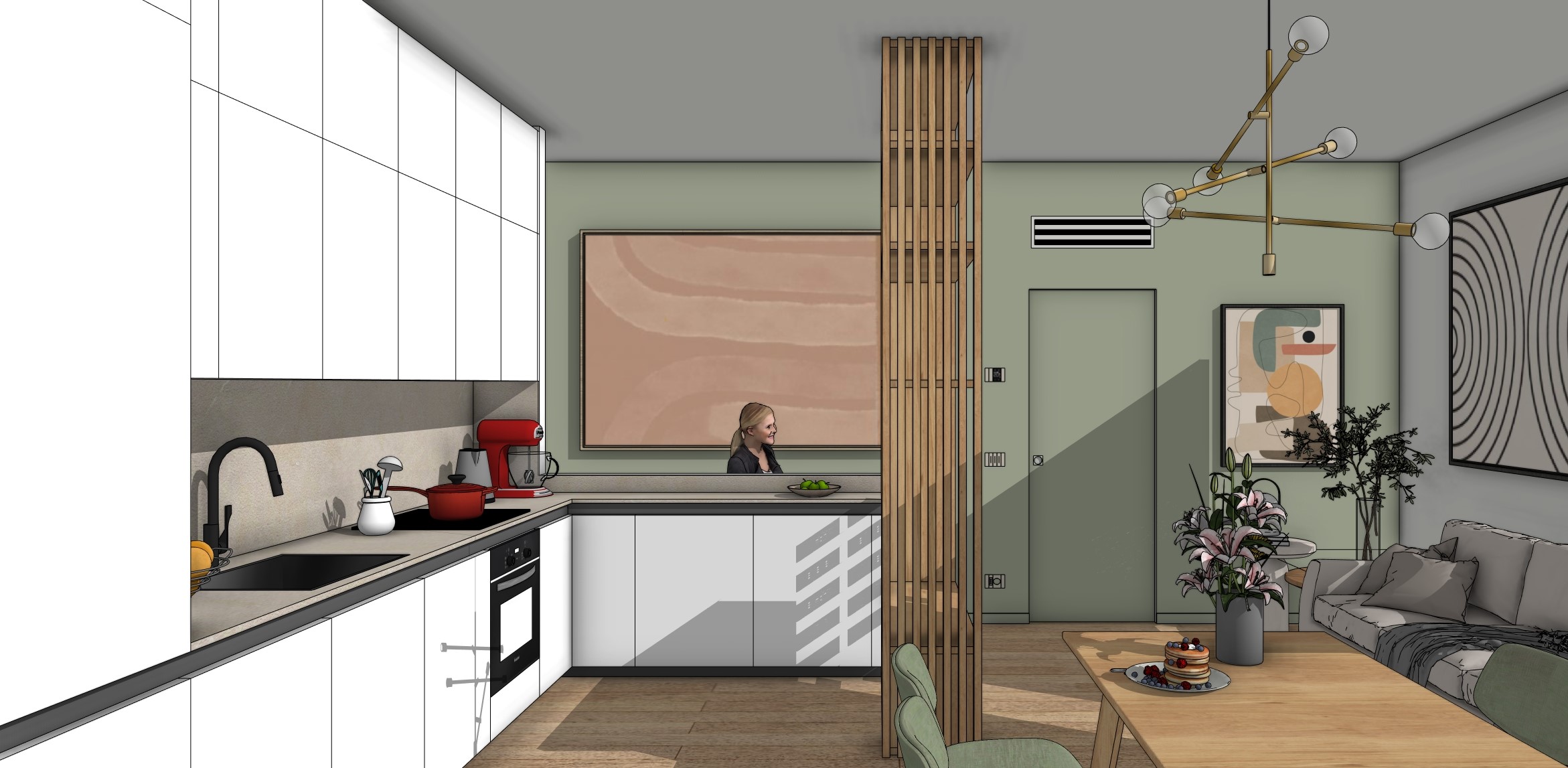 kischen top and splashback on the left are in sand color limestone green wall in the background is plain color not textured