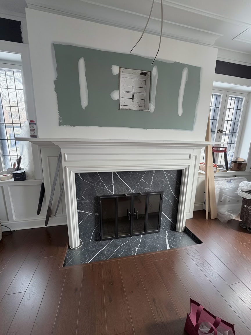 add wall mounted flush frame thin frame tc above fireplace add applied mouldings on wall around it to match trim on mantle below