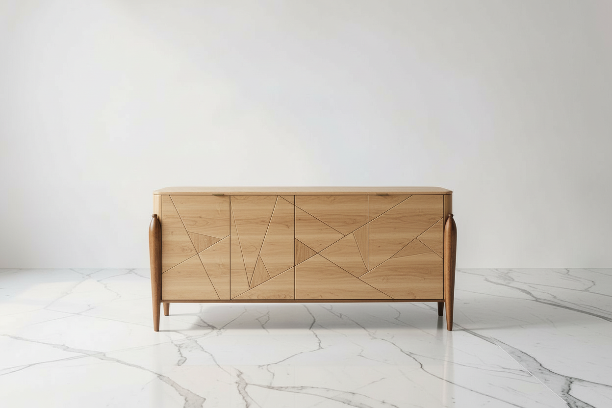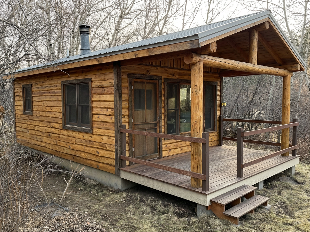 rustic wooden cabin in a serene forest setting surrounded by bare trees the cabin features warm rich brown logs and a slightly darker brown accent on the windows and railings the roof is a soft gray with subtle metallic sheen adding a touch of modernity to the rustic atmosphere the front porch is a cozy wooden deck with a minimal log and black baluster railing inviting and simple the scene has a tranquil early evening ambiance with soft golden lighting casting gentle shadows creating a peaceful and inviting feel the ground is covered with subtle green and brown grass complementing the natural earthy tones of the cabin
