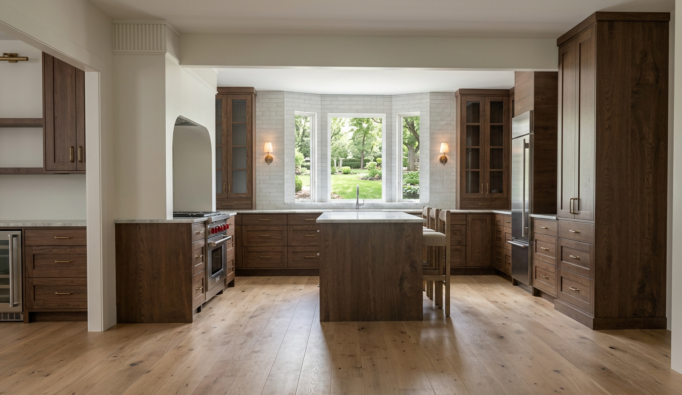 ultra realistic kitchen rendering based on a sketchup model realistic cabinetry materials sw white flour painted range hood all other cabinetry in a walnut stain including the bar in the adjoining dining room crystallo quartzite countertops with subtle veining accurate texture scale white oak floors with subtle wear and color variation matte white painted walls and ceiling with slight texture realistic fabric upholstery with visible weave rectangle windows overlooking a spacious yard physically accurate reflections and shadows soft indirect light global illumination professional interior photography crisp edges high detail clean modern aesthetic full frame camera 28mm lens