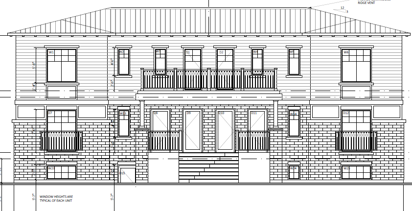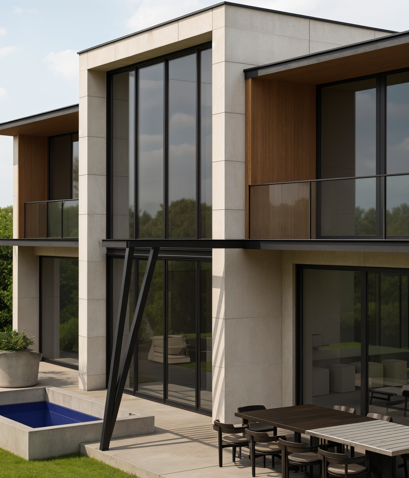 render with charcoal grey cement board siding and a multi size manmade stone architecture