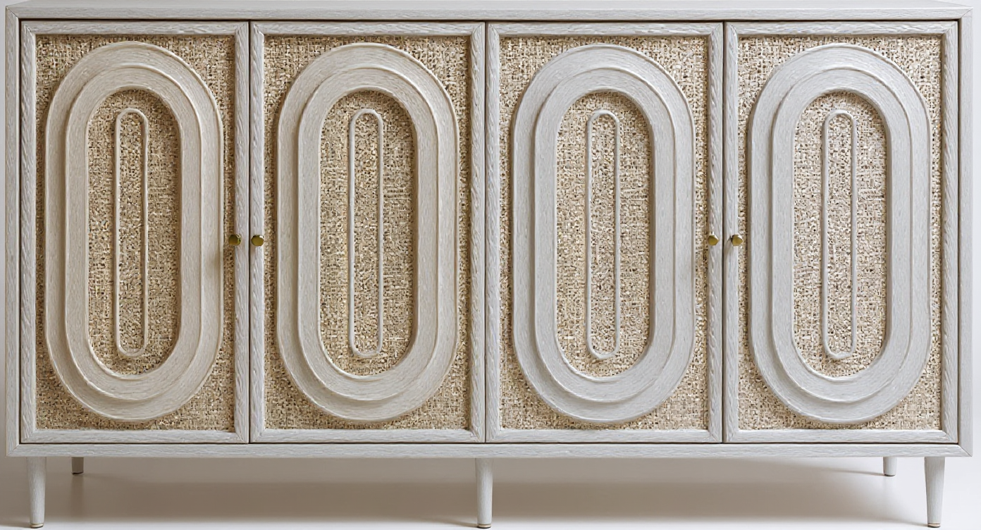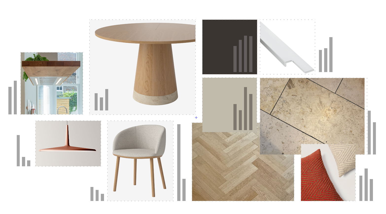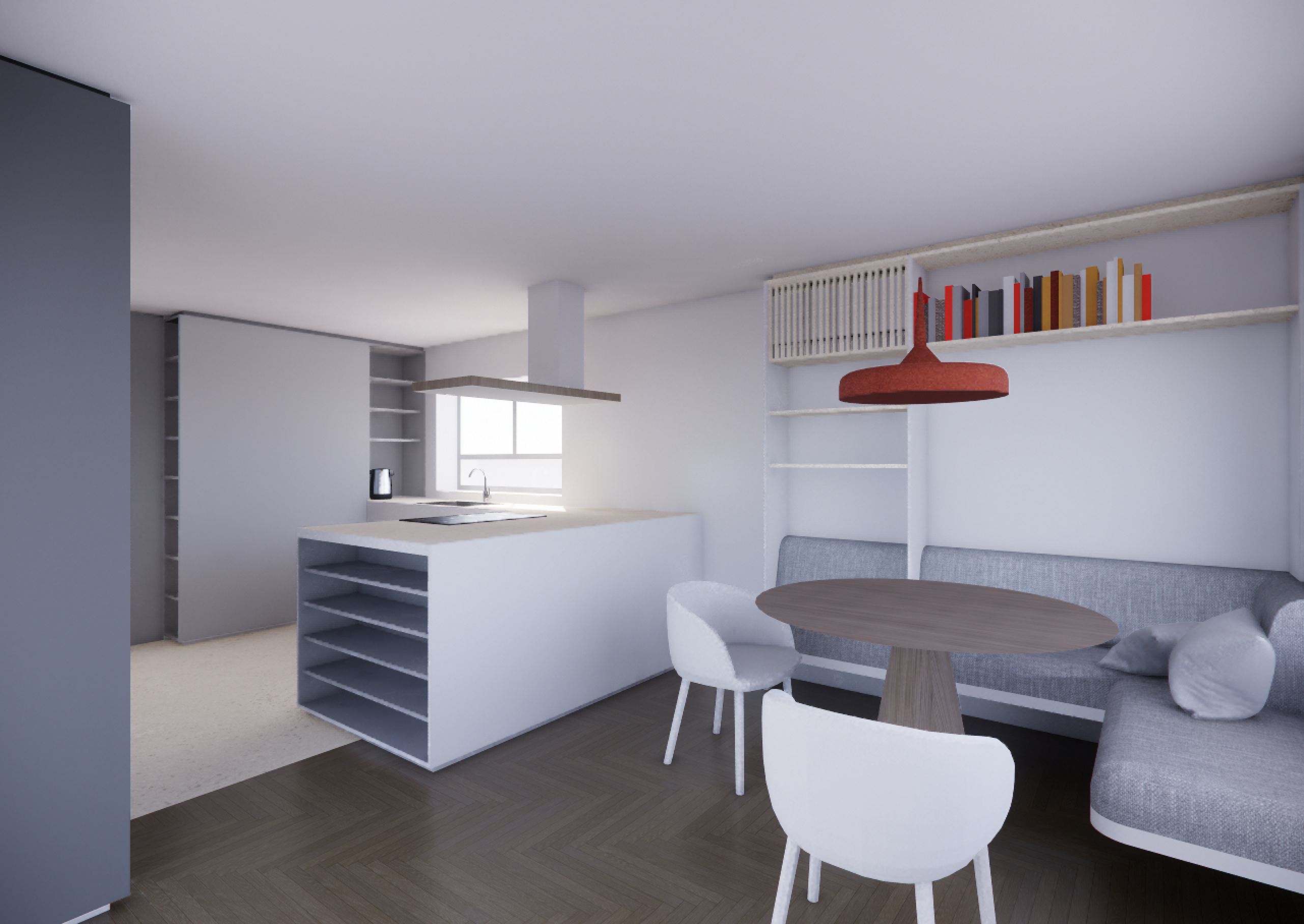 interior shot photorealistic interior render of a small kitchen and dining corner in soft daylight keep the exact camera angle of the input image replace materials according to moodboard dining table light oak wood with natural stone base dining chairs light beige fabric with oak legs bench upholstery soft grey beige textile cushions one neutral beige one accent cushion in warm brick red with herringbone texture floor light oak herringbone parquet kitchen island and tall cabinets matte warm greige fronts minimal and handleless worktop light natural travertine extractor hood oak paneling as on reference moodboard with integrated lighting pendant lamp above table terracotta red matte finish add subtle styling a few green plants quiet book colors no clutter lighting soft diffused daytime light warm calm realistic high end editorial style ultra realistic 8k cinematic materials subtle depth of field no people