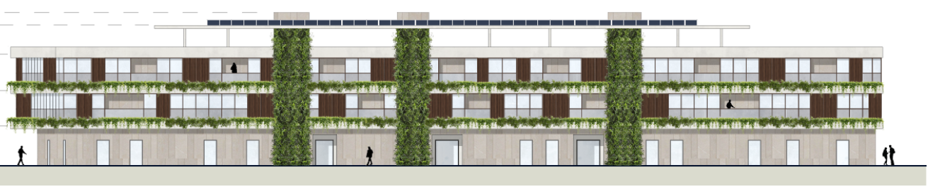 make a realistic render view highlighting the texture of the facade add details like trees and people and keep the photo setting