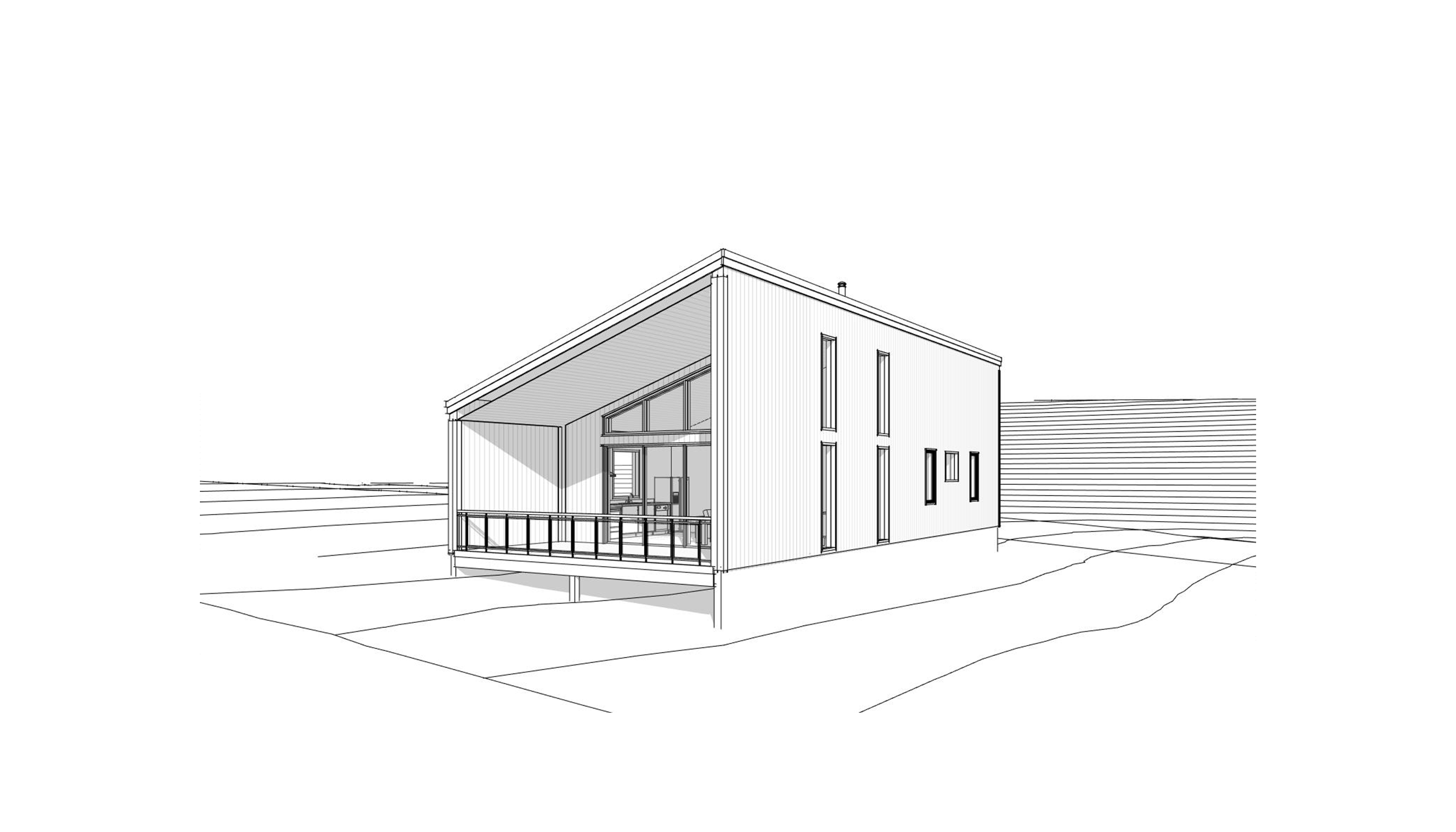 front view of a clean contemporary cabin architectural exterior home rendered in cinematic lighting with bits of blue skies and sunlight coming through the clouds cabin in a coastal setting with faint streaks of light coming through trees in the surrounding area warm glow and coastal reflections off of the windows cloudy and stormy sky shining rustic select grade vertical wood siding green manicured landscape around structure with gardens and patches of grass black standing seam metal roof prominent trees in the background high fidelity photorealistic visualization crisp shadow falloff refined facade geometry soft atmospheric depth premium architectural photography mood ultra clean composition and materials black window trim flat roof photorealistic render