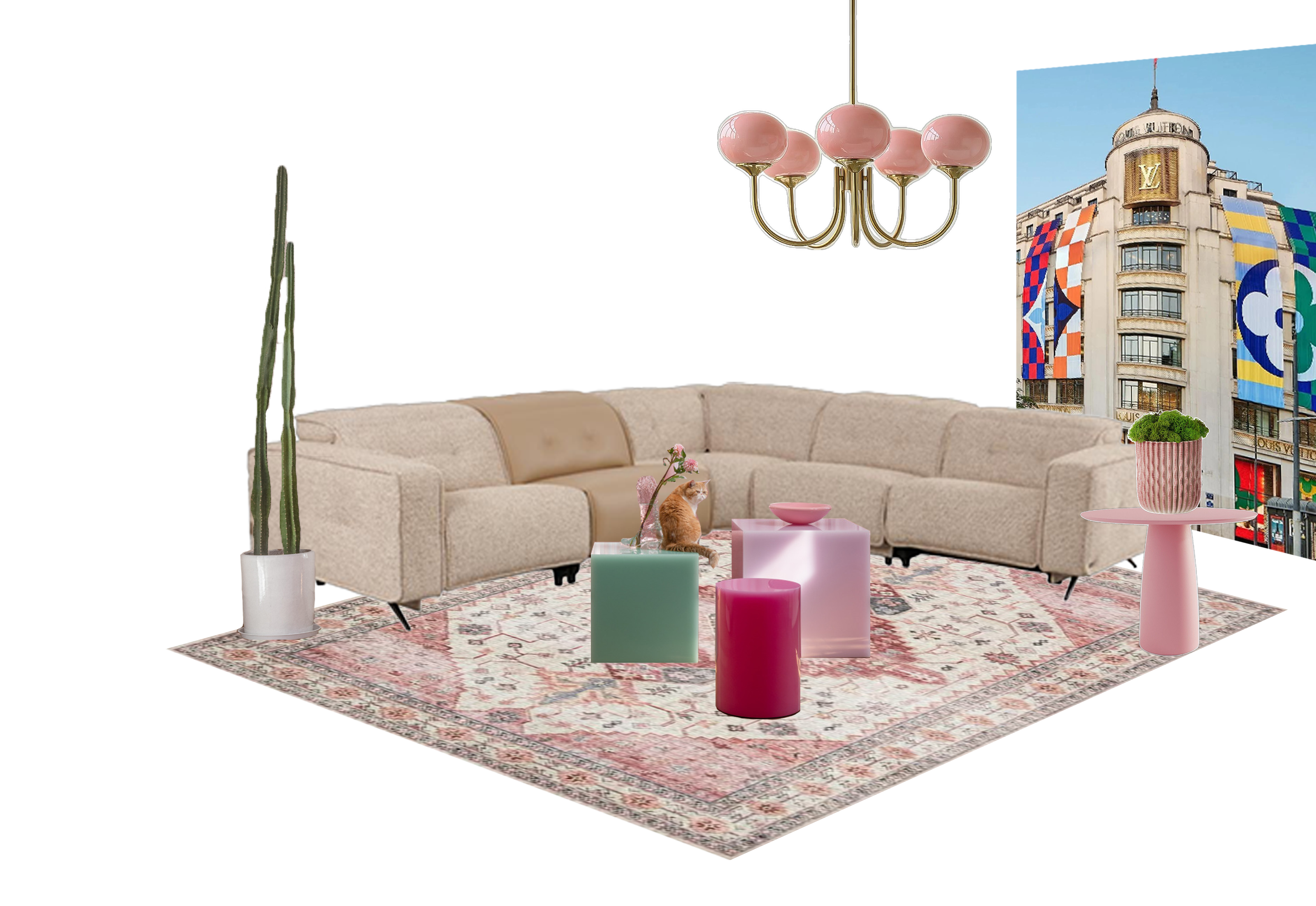 create a warm and cozy colorful spacious living room with a mid century modern aesthetic creating a soft and elegant atmosphere place a fluffy beige l shaped sofa in the center of the living room surrounded by a soft pink and cream vintage rug add a small pink round table with a potted green plant and the wood colored patchwork flooring there s also a bright pink cylindrical table and a translucent pink square table with a bowl on top warm abstract modern art hangs on the walls and a chic pink spherical brass chandelier hangs overhead a window reveals a landmark building add a touch of greenery with soft decorative elements and a tall cactus in a white pot adjust the lighting to create a warm and inviting atmosphere