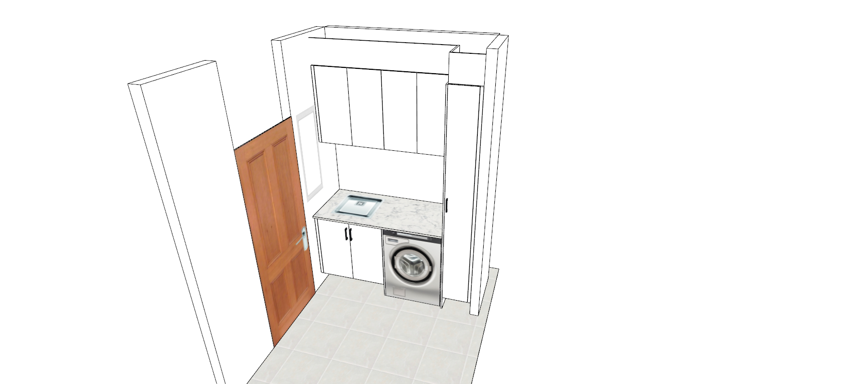 white flat panel cabinets door to be a light oak fill in the wall above the door some evening sun coming through the small window next to the sink