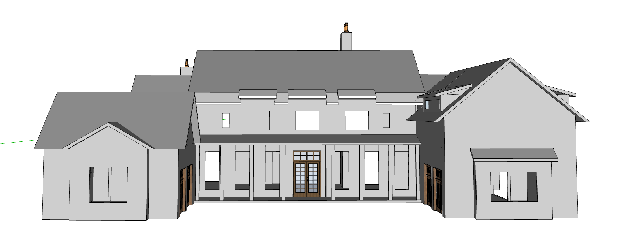 render this 3d model to look like a photorealistic house the roof should be a modern bronze standing seam metal roof the exterior walls should be horizontal siding that is painted a creamy white color similar to sherwin williams greek villa the windows should be bronze metal windows there should be beige shutters on the windows the dormers should have a shed roof detail the chimney should be constructed out of a reclaimed brick with a copper chimney cap the entire house should be styled like a low country estate it is summer and the landscape is lush the home is located in southern marshland