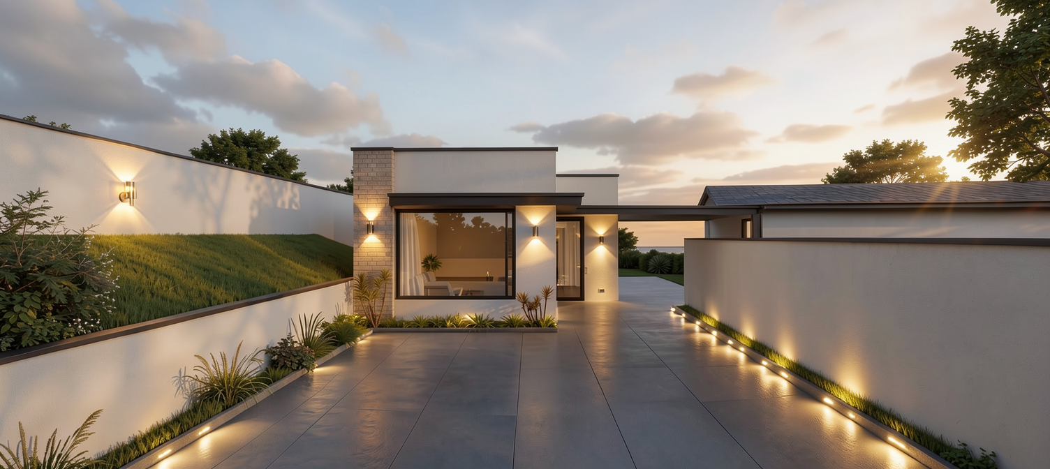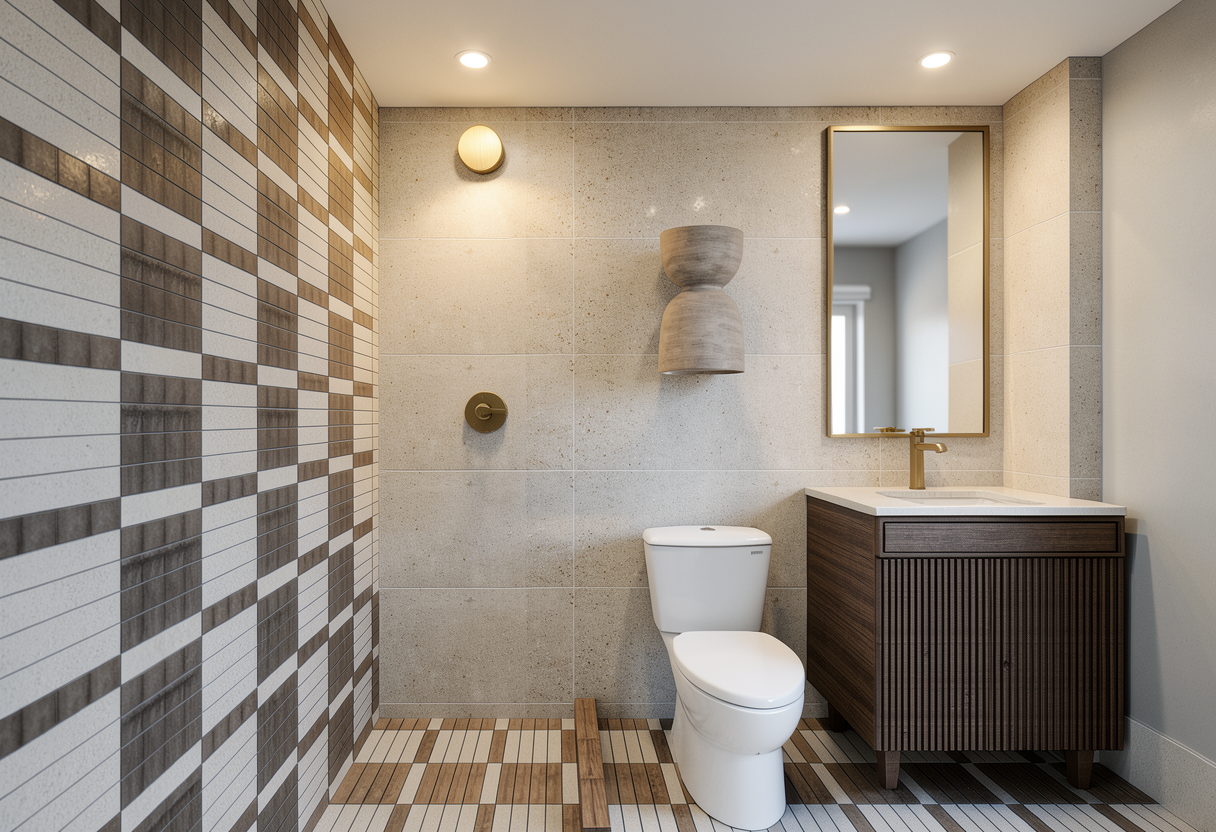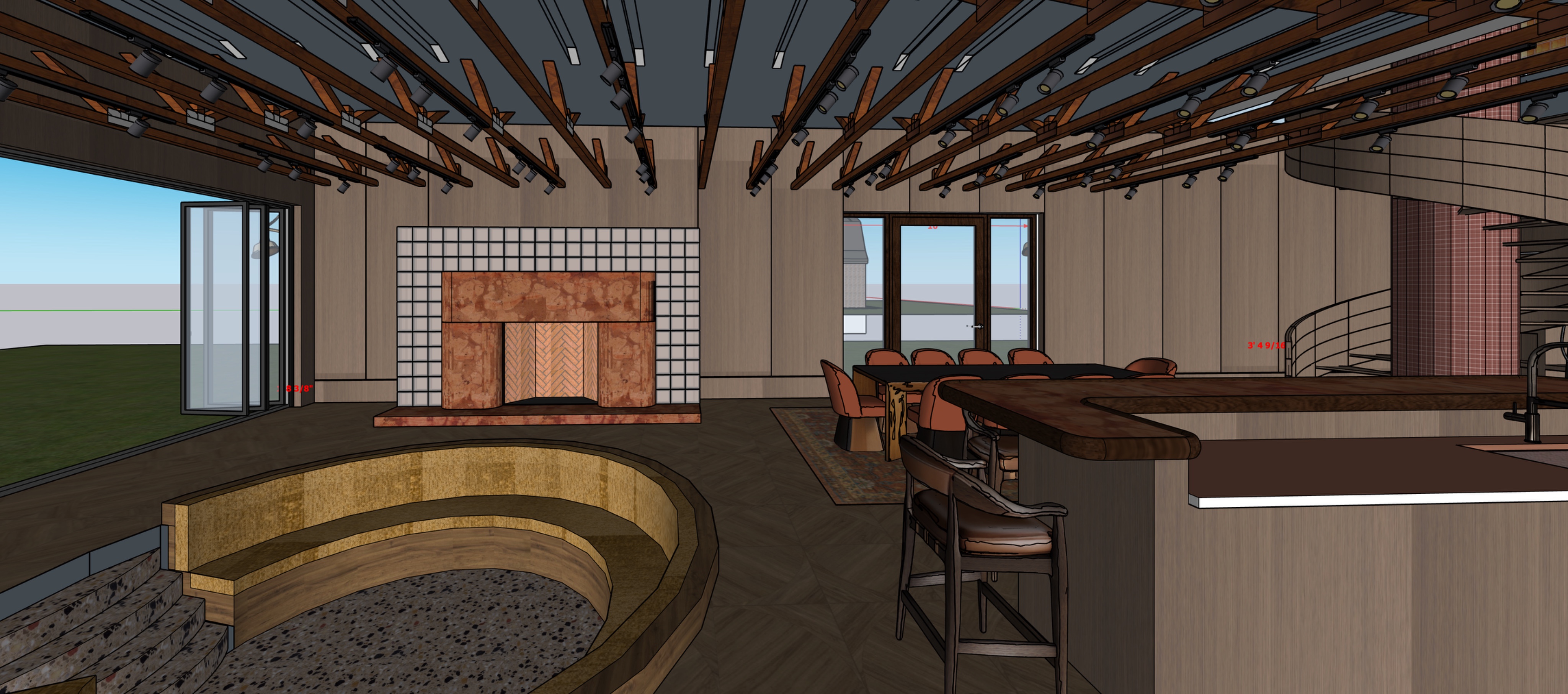 while carefully preserving the original layout colours textures and geometry of the scene render it with detailed shading natural lighting transforming it into a hyper realistic professional quality photograph of the architectural design the blocks around the fireplace are glass block with a bronze colour inside the stair railing is solid wood the countertop surface is the same material as the marble on the fireplace