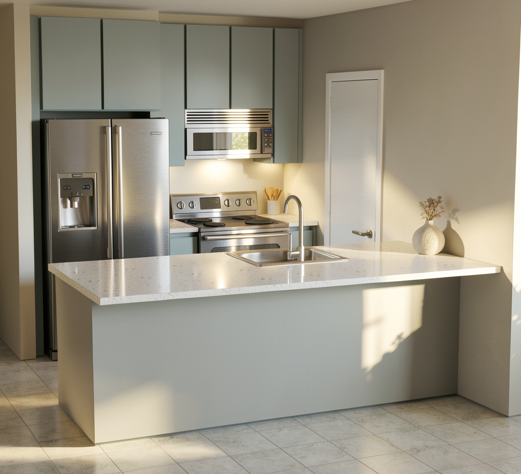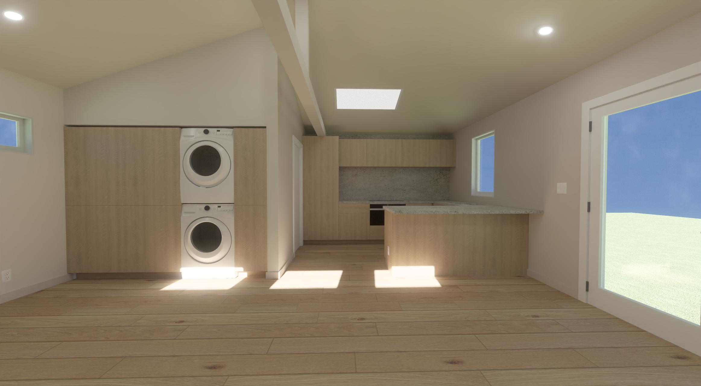 show this space is hyper realism dhow white oak on all cabinetry and staged remove the faucet from the back wall and keep it in front of the window show thisimage as a sunset lighting