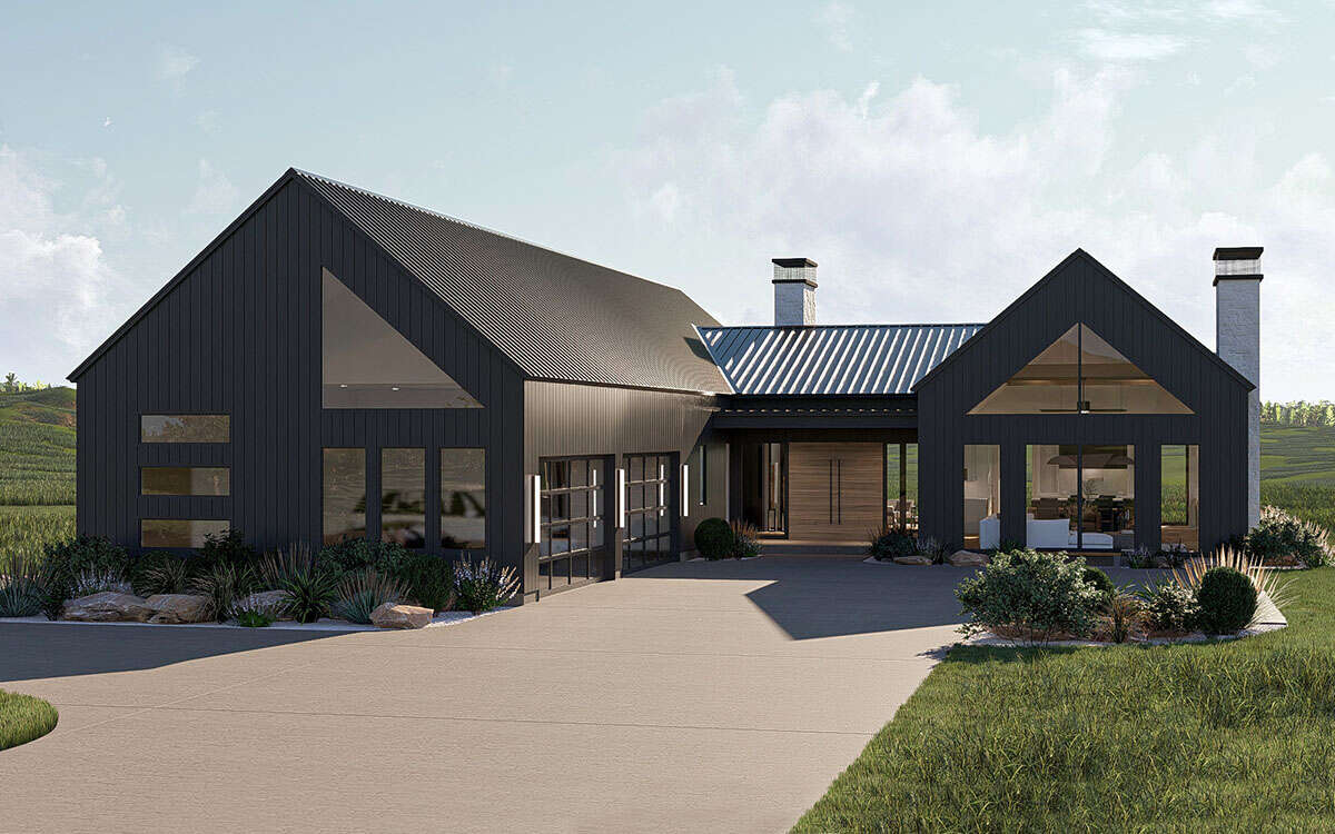 render a modern farmhouse set in a serene countryside the building features dark charcoal grey metal siding and a roof with a slight sheen two large stone chimneys in light grey add a rustic touch expansive glass windows reflect the soft diffused daylight in the foreground lush green grass and landscaped shrubs with accents of natural stones provide a welcoming path to the entrance the sky is a soft blue with gentle clouds creating a tranquil and inviting atmosphere