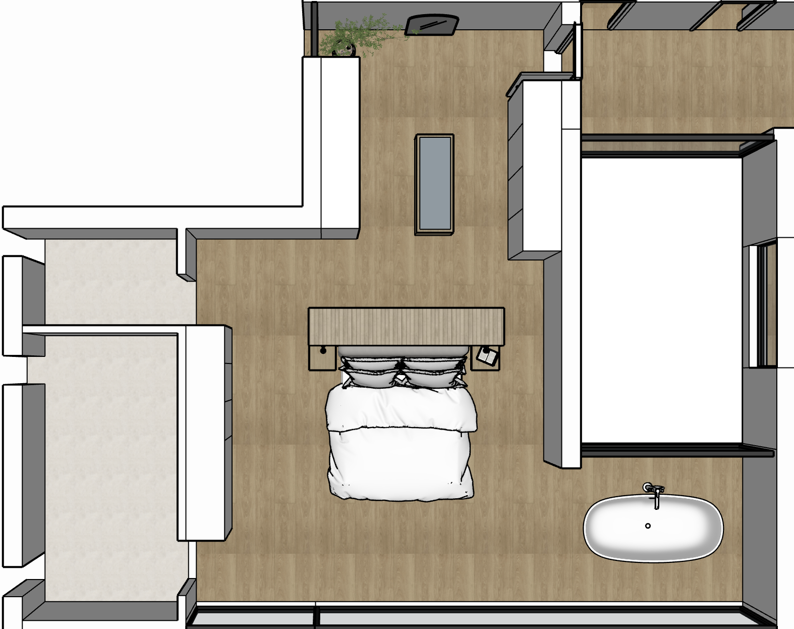 en la parte derecha donde hay un cuadrado blanco poner en planta copa de arbol grande que cubra casi todo el espacio con piedras decorativas abajo el mueble del cabecero de la cama es en madera de palillero de roble cabecero cama en color mas blanco la parte izquierda vac a es el ba o la estancia mas grande es ducha y lavabo doble y en el mas chico inodoro