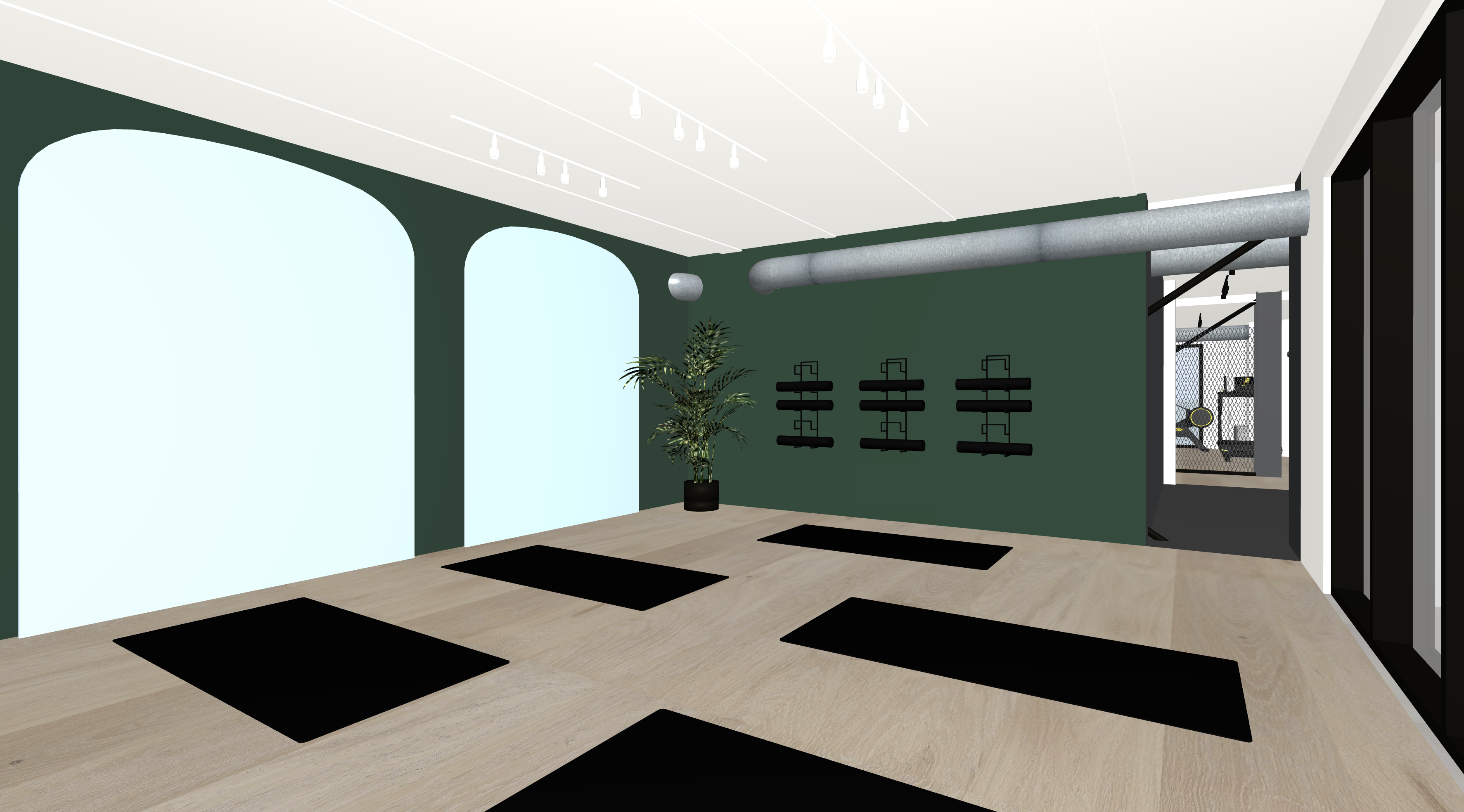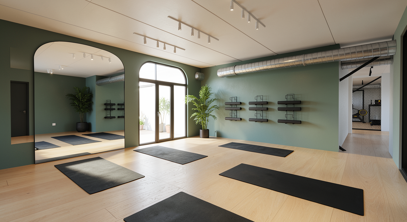 e una sala yoga a terra abbiamo un pavimento in parquet in rovere chiaro continuo a liscio sulla parete di destra ci sono in alto tubi in acciaio zincato sulla parete di sinistra ci sono due grandi specchi a forma di arco gli specchi riflettono la parete di fronte che ha una grande portafinestra divisa in quattro parti