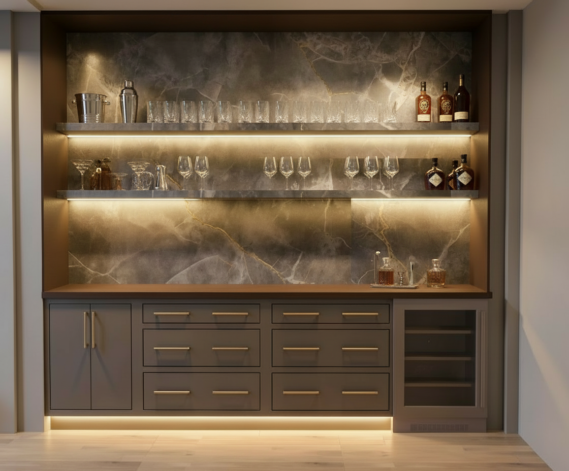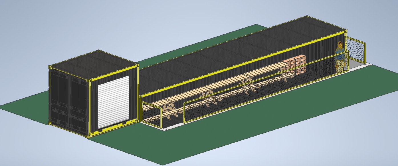 exterior shot render a detailed shipping container structure with a sleek modern design use a dark charcoal color for the container walls contrasted with vibrant yellow edges for a contemporary look the roof is also charcoal providing a unified appearance the roll up door is bright white standing out prominently the fencing and gate are galvanized steel adding industrial charm the interior includes wooden benches and tables in natural wood tones set the scene on a lush green lawn with a soft blue sky overhead and create a calm sunny atmosphere for an inviting outdoor space