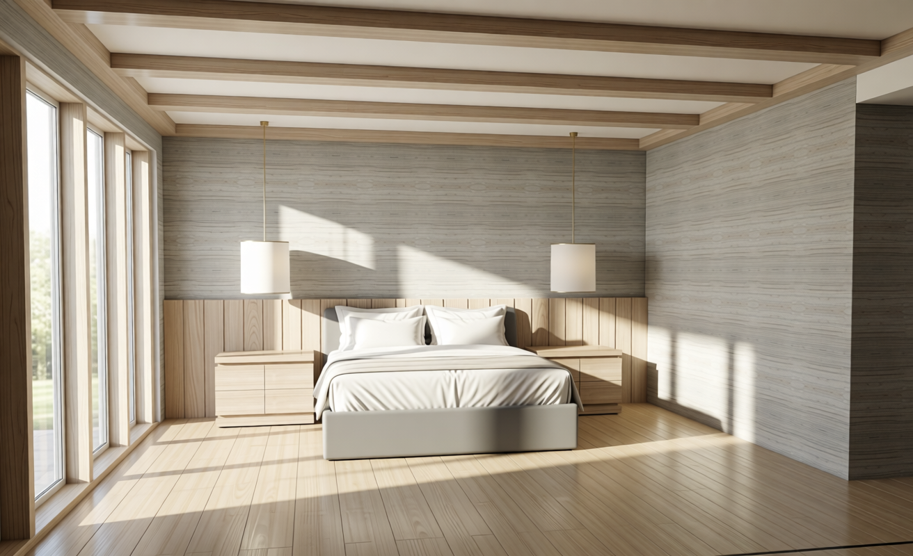 add a sunny ocean view through the window add elegant light gray bedding