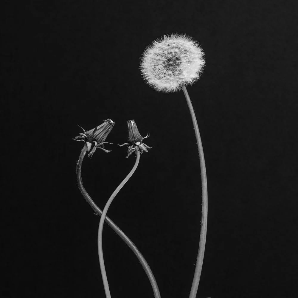 a trio of dandilions in elevation view need to be represented as architect pencil sketch to represent a botanical diagram of elements in profile two are interteined and seedless after bloom drying state and the right one has a full global head of seed tufts ready to disperse on slightest wind needs fine architectural drawing technique to represent structure accurately architecture