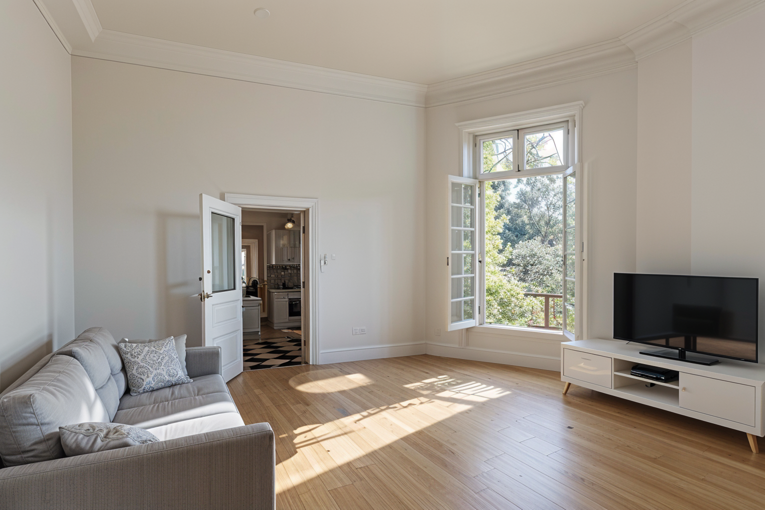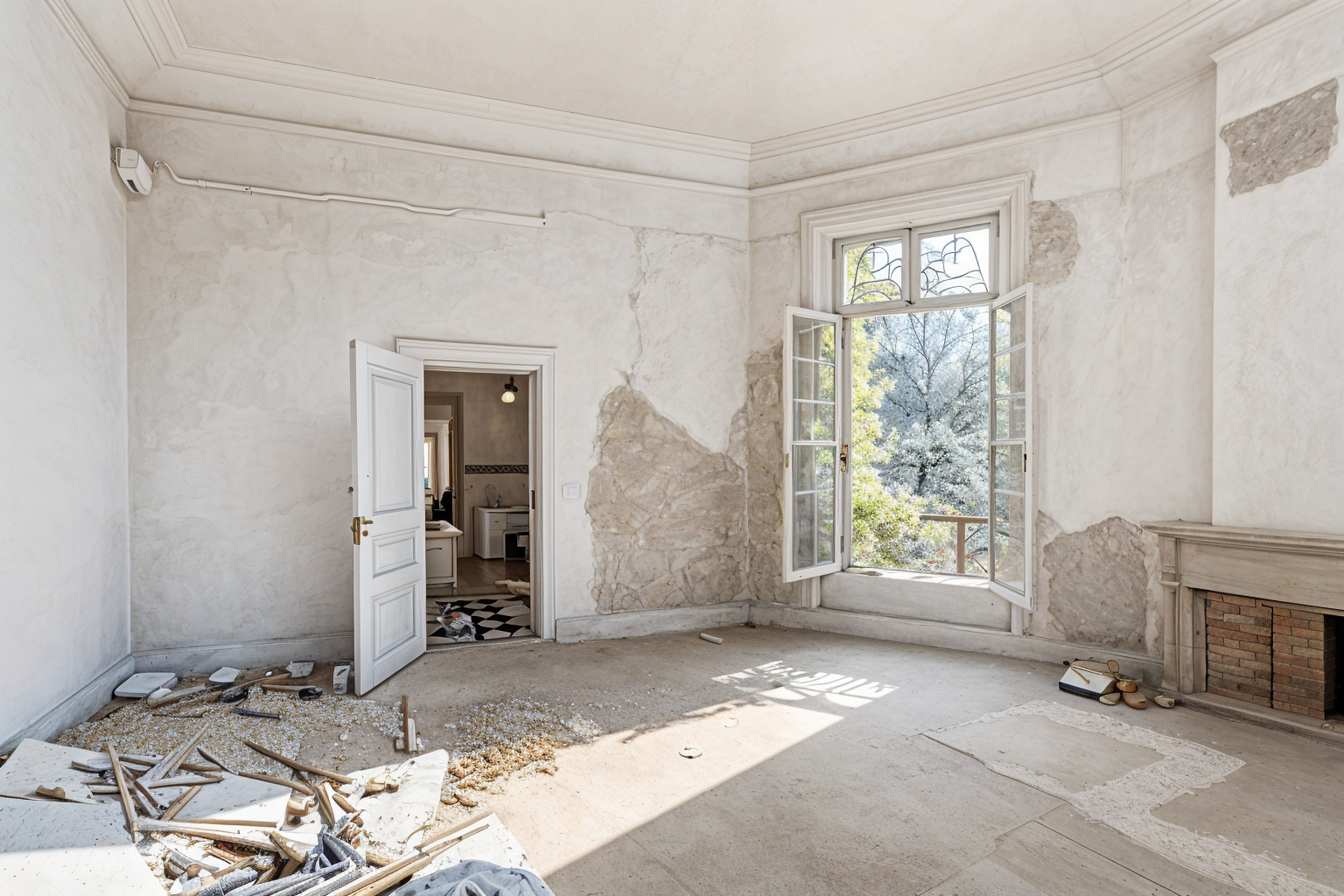 clean this up and furnish it like a modern living room paint the walls white keep the structure of the walls and windows same dont change the room