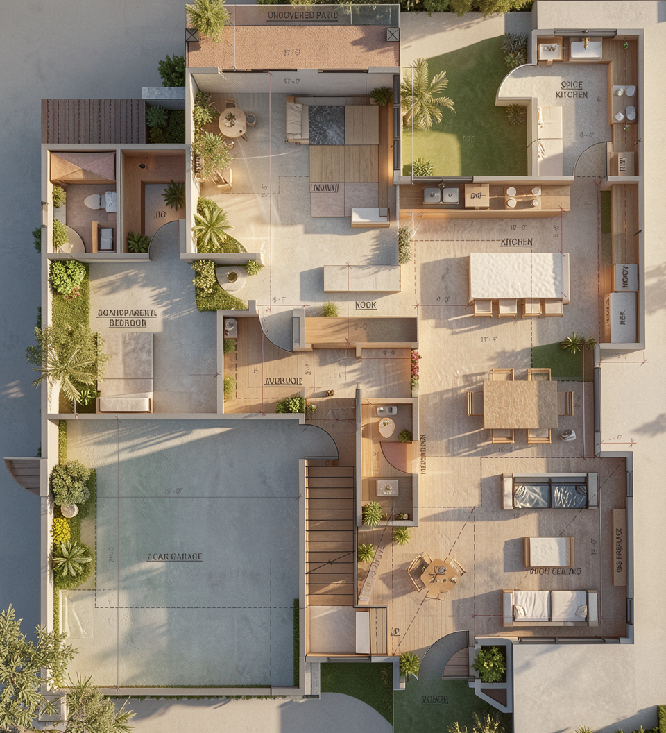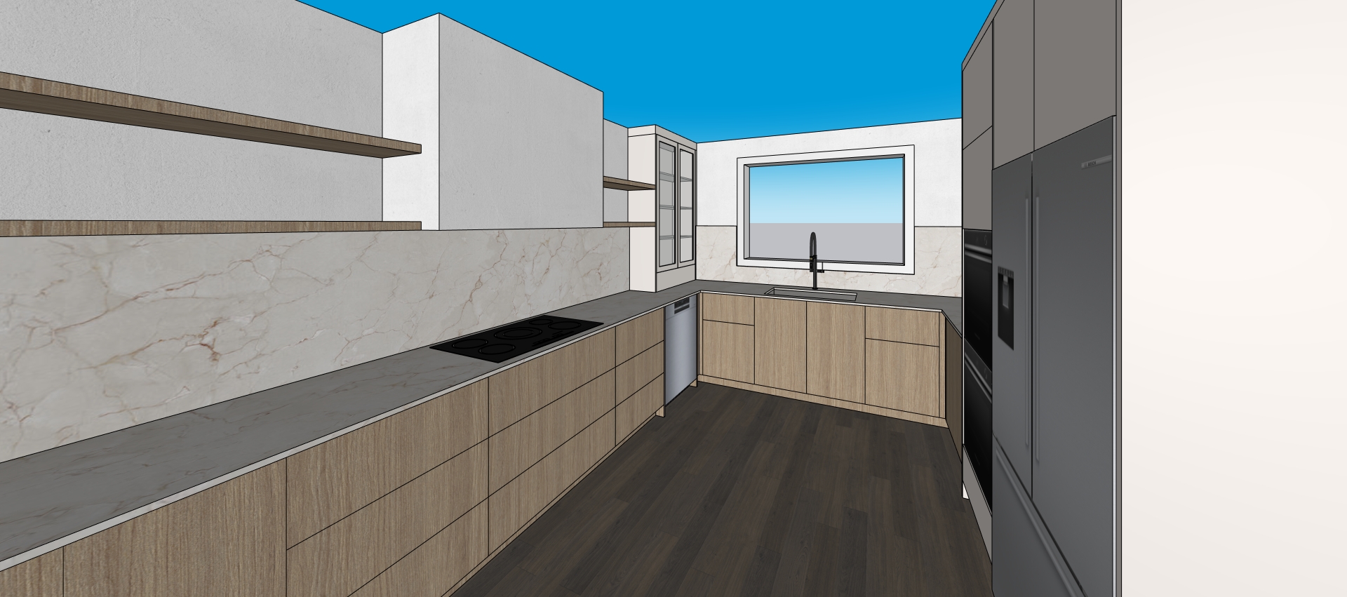 render this japandi style kitchen by adding realistic materials lighting and decorations maintain the structure layout dimension and design of this kitchen walls and insert hood are off white plaster floating shelves and base cabinets are natural oak matte upper and tall cabinets are off white painted mdf with sheen level 50 there are induction cooktop dishwasher black matte sink faucet double wall oven and french door refrigerator glass cabinet has frosted glass add shelf lightings glass cabinet lightings ceiling will have modern white track lightings add modern roman shade in the window in white linen add minimal decorations like stacked plates planter cook book in japandi style