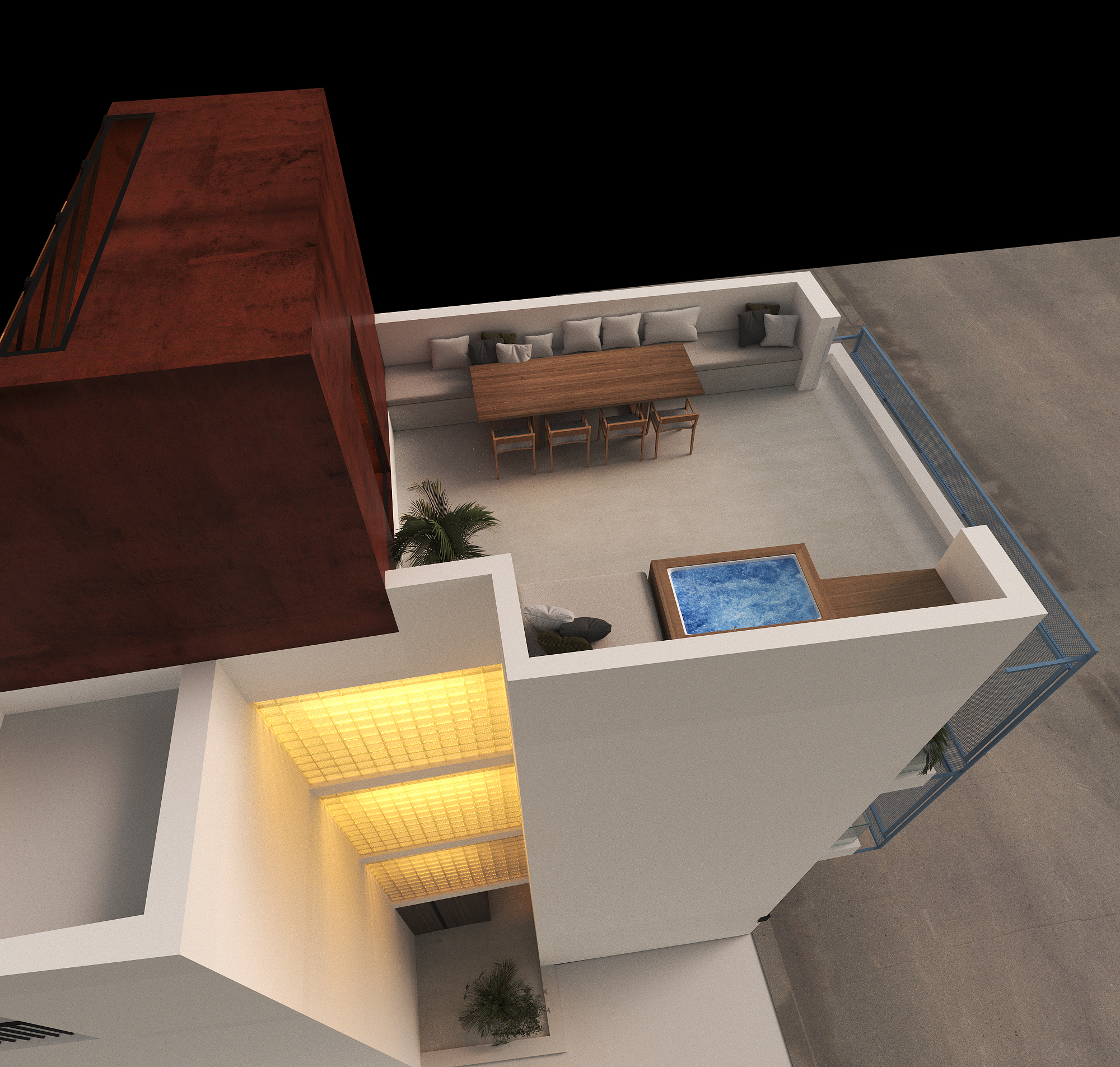 dont change anything about geometry only remove pool table with chairs and sofa with pillows in the terrace replace with a modern custom sculpted cast in place white concrete pool with organic flowing curves minimalist light gray concrete decking with integrated warm led strip lighting subtle artistic concrete planter boxes with ornamental grasses modern metallic pergola with adjustable louvers stylish rattan lounge furniture ambient led strip lighting and add warm sunset hour lighting 8k resolution realistic dont change angle other objects dont mess with geometry everything else the same
