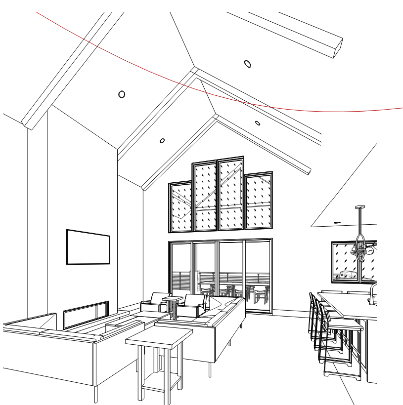 make this rendering more realistic and the light should resemble clear mid day daylight match the existing building shapes and forms the fireplace should be stone and the beams should be wood