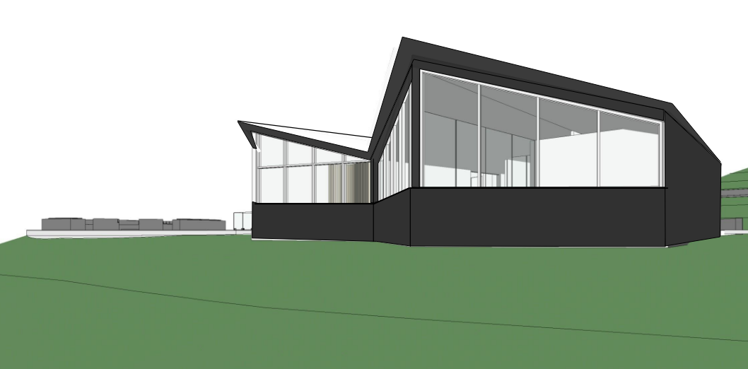 preserve building geometry and proportions harden edges to keep realistic do not redesign structure modern bathouse spa welness centre with internal spa saunas and ice baths dark burnt cladding black vertical charred timber cladding matte finish slim black aluminium frames concrete fire pit in distance smoke and warmth coming from fire glazing should show tinted exterior reflections with subtle warm interior glow only to take away from unfinised interior interior not fully visible maintain positioning of internal finishes only adapt colour natural warm tones earthy retreat landscape hierarchy low native grasses near villa only pathway lighting positioned evenly along path edge only no random scattered lights vineyard rows clearly in mid to far background distant tree line on ridge time of day late blue hour getting darker soft glaze soft sky gradient controlled lighting realistic shadow depth premium winery retreat mood negative no added furniture no dramatic spotlighting no suburban garden styling no cinematic overexposure