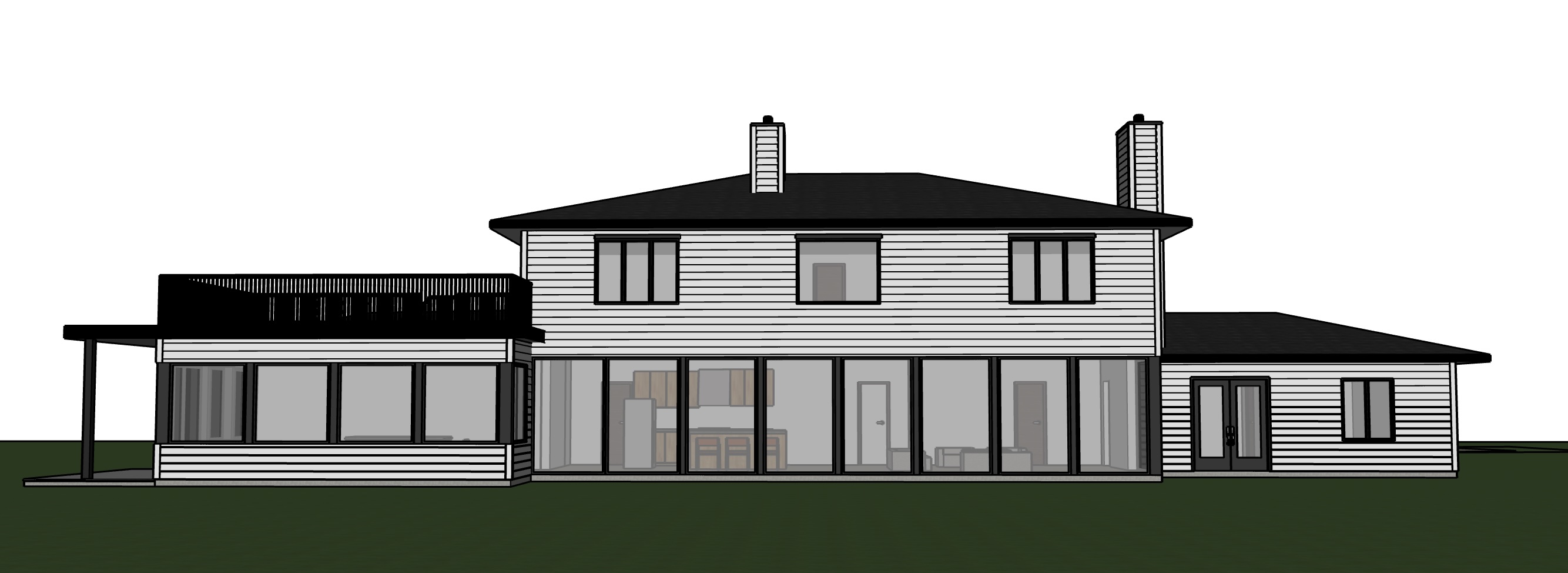 watercolour rendering no changes to architecture in image provided white siding for exterior roof are black add some subtle landscaping local to qc forest in background railing in model is black iron rods do not add in any additional railings not already in the model do not add any pathways this is the rear side of the house show grassy yard make windows opaque