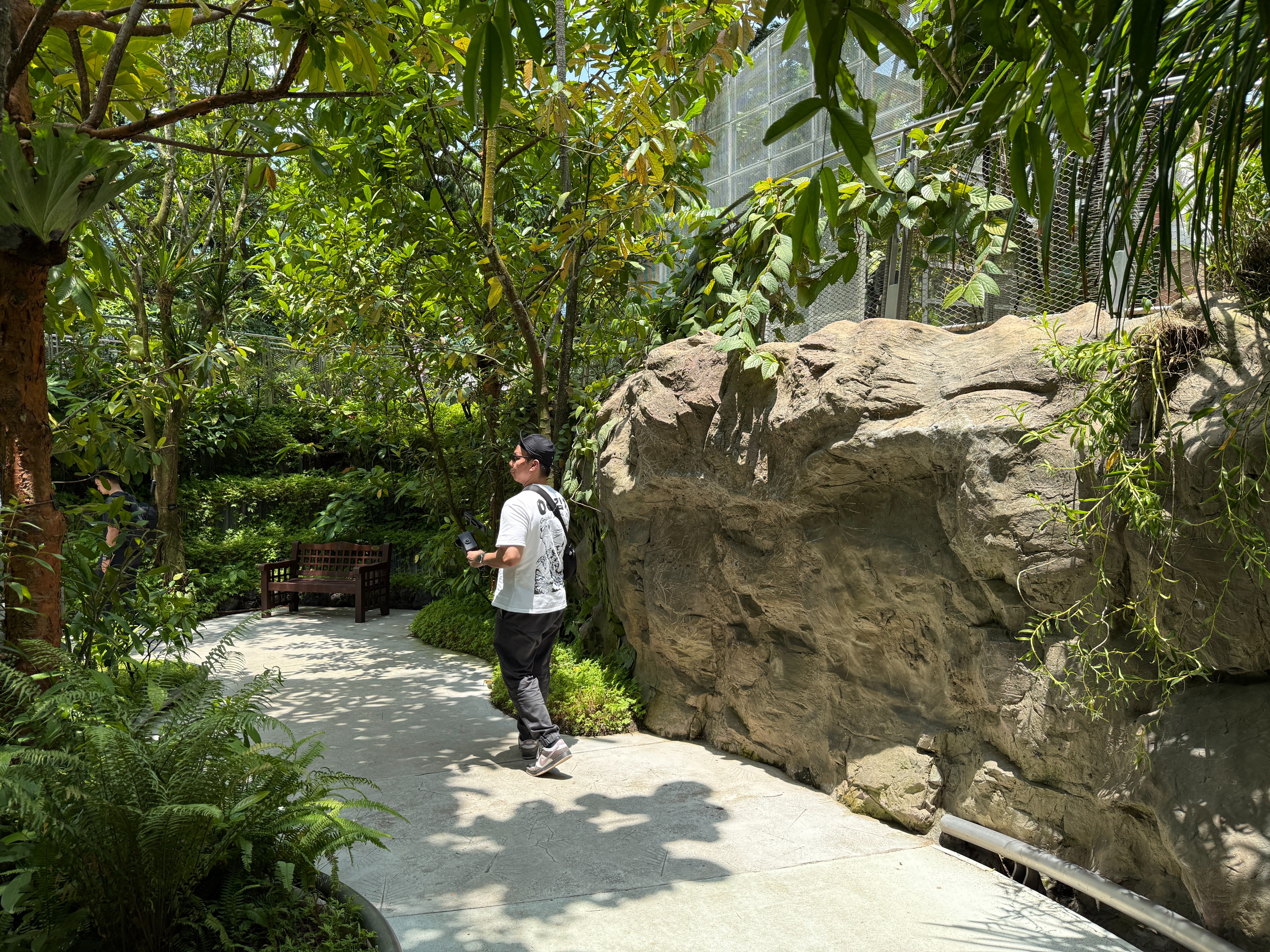 a render of a night light installation at the singapore national orchid gardens along the rock wall is a textured leafy soft light installation