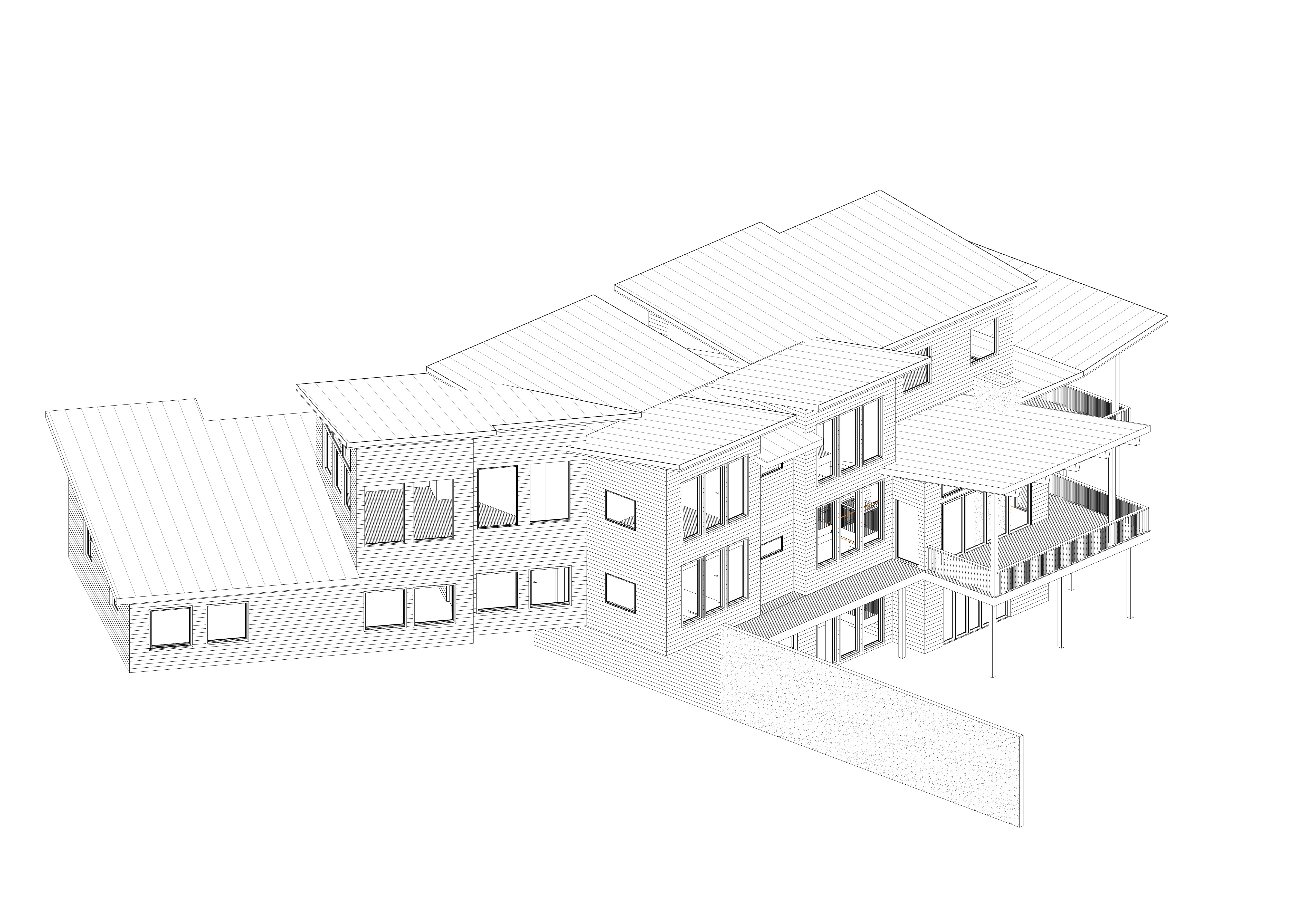 modern mountain home on rolling green hills with conifer trees vertical wood board and batten siding stone chimney with pink plants at perimeter with interior lighting garage door with windows
