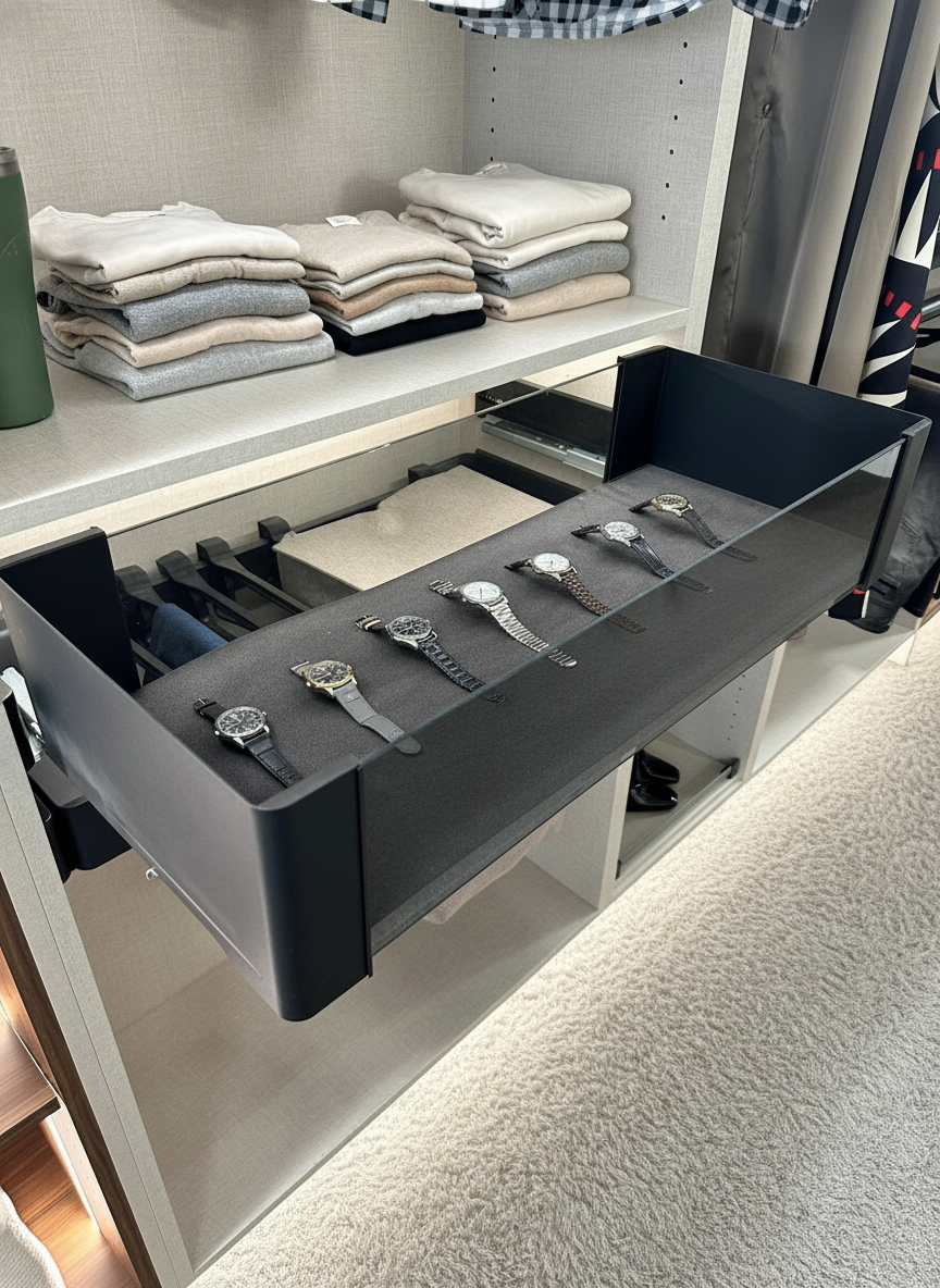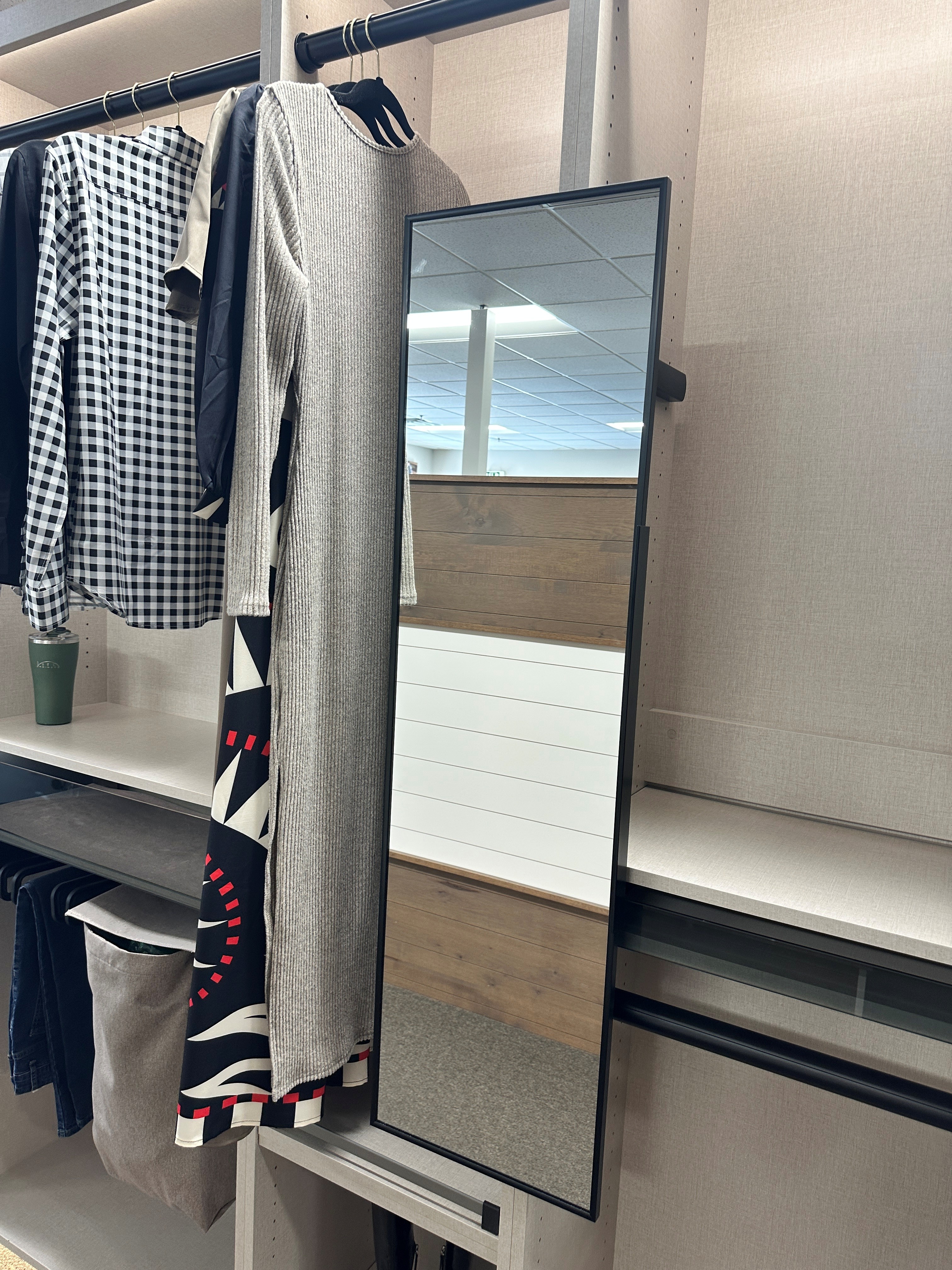 add natural light remove the coffee mug change the reflection to a luxurious closet that matches add new clothes