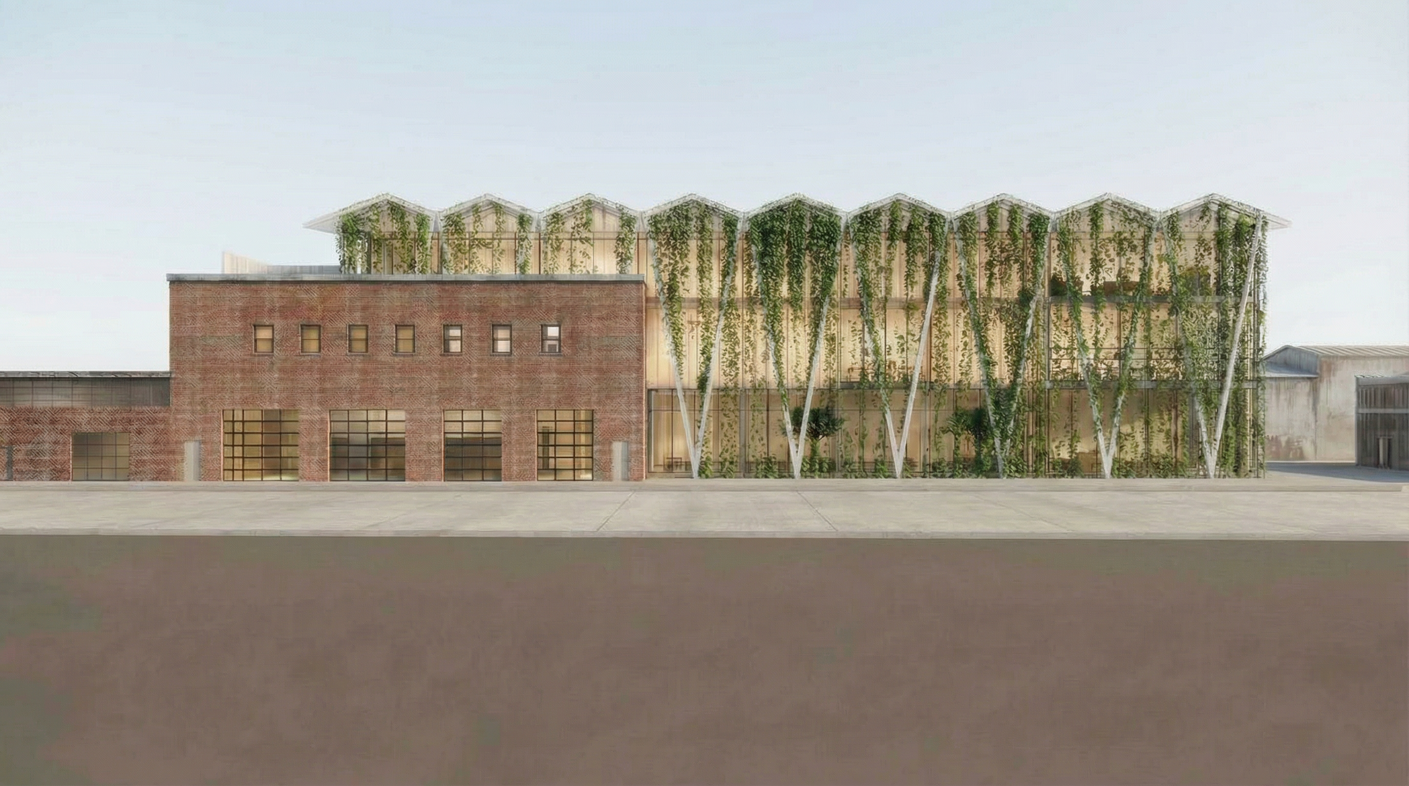 using this exact starter image do not alter any buildings materials proportions or vines keep the lighting fa ades and context unchanged simply replace the existing blue sky with a soft grey overcast cloudy sky no added reflections no haze no scene edits sky replacement only