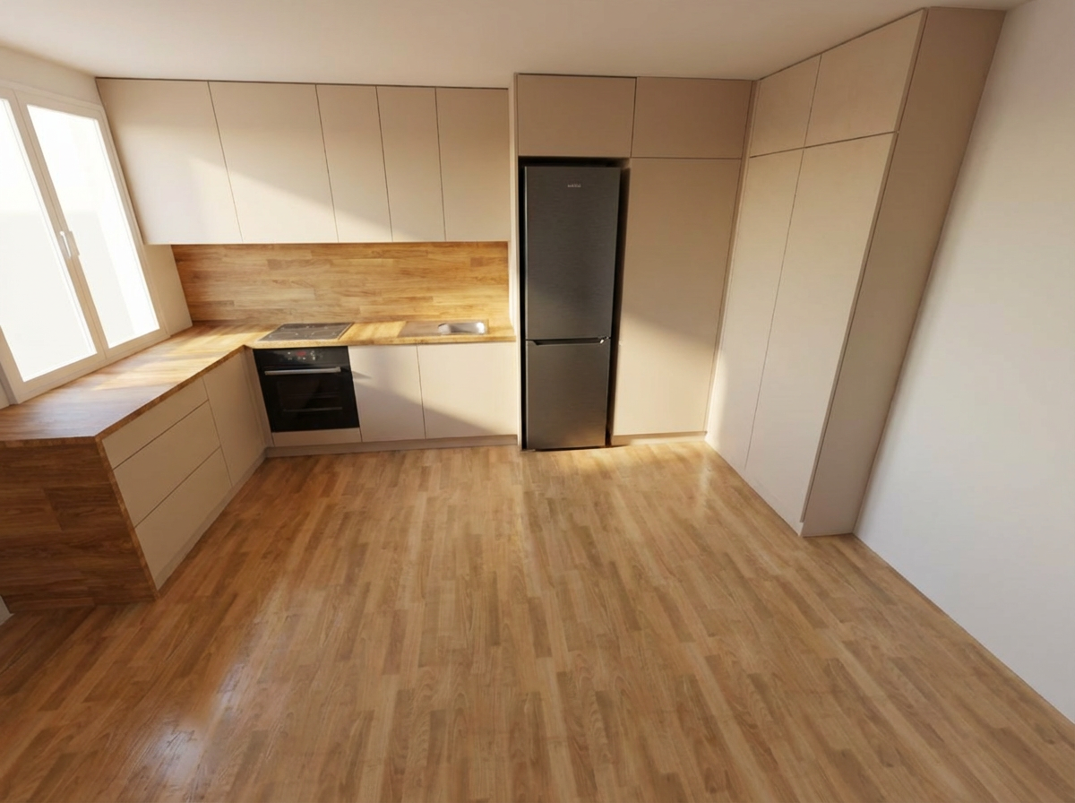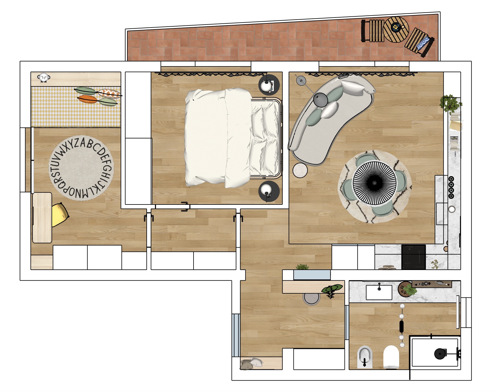 convert this floor plan into a realistic isometric 3d view of a full house show the space from an elevated angle with furniture walls and details visible warm lights light colors nordic vibes use the same furniture as shows on the plan do not change the orientation of the floorplan
