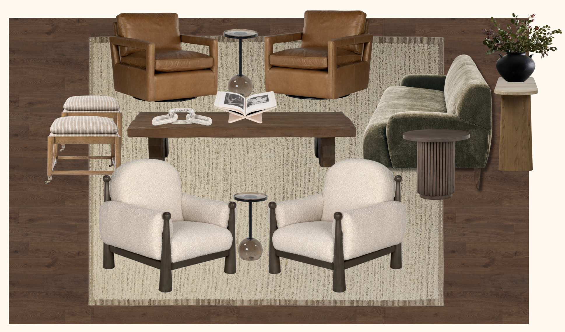 put all this furniture in a house on anna maria island that is on a canal facing the mangroves the ceiling height is 25 heigh there are floor to ceiling windows on the back wall behind the leather chairs the left wall has a transom window that goes from wall to wall and is 2 in width the right wall has a large opening with reclaimed wood beams encasing the opening