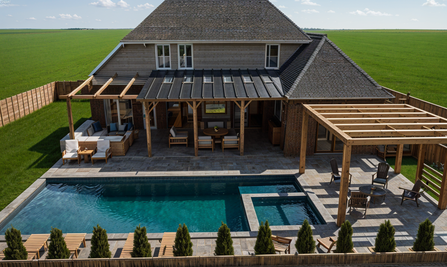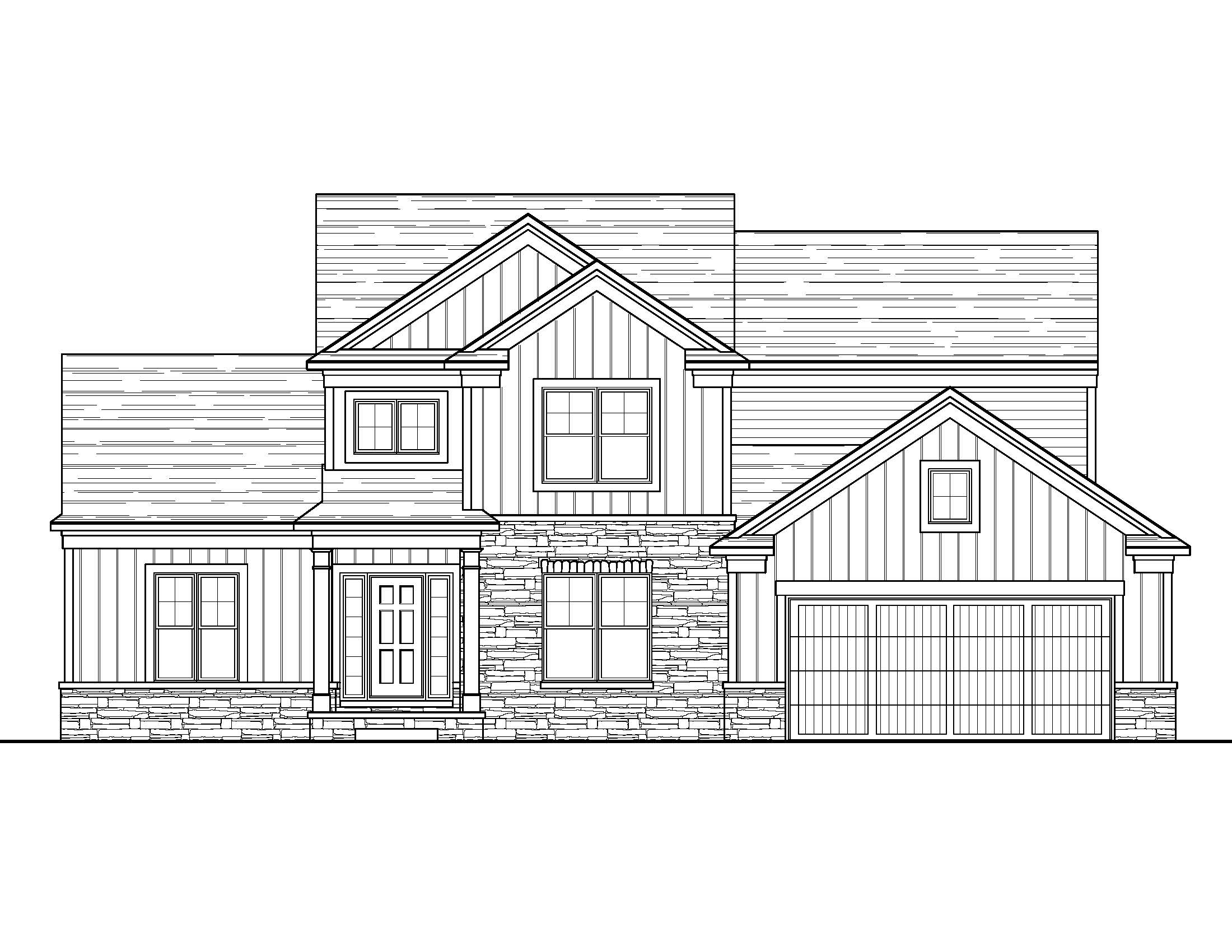 5 30pm early evening blue sky w a few clouds sun reflecting off windows modern farmhouse streetscape lush lawn and landscaping w a few colorful flowers earthtone stone white vertical siding dark grey shingles and fascia frieze light grey horizontal siding