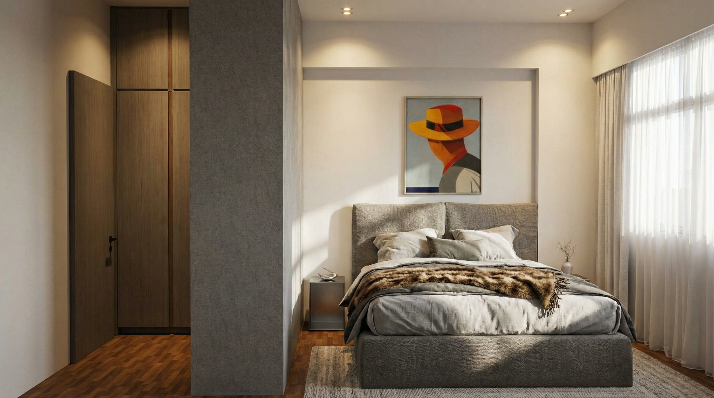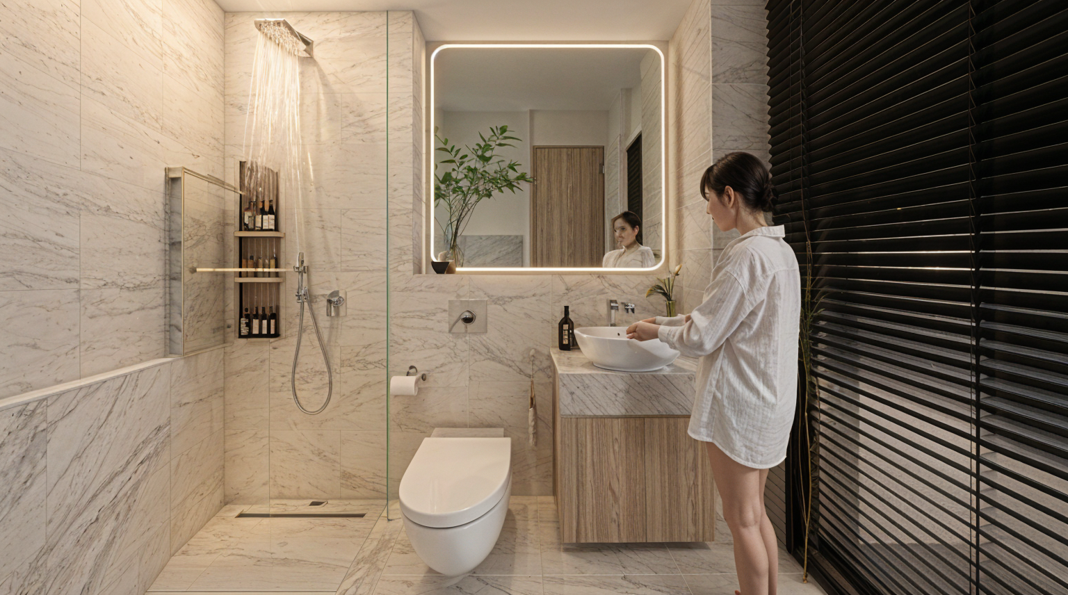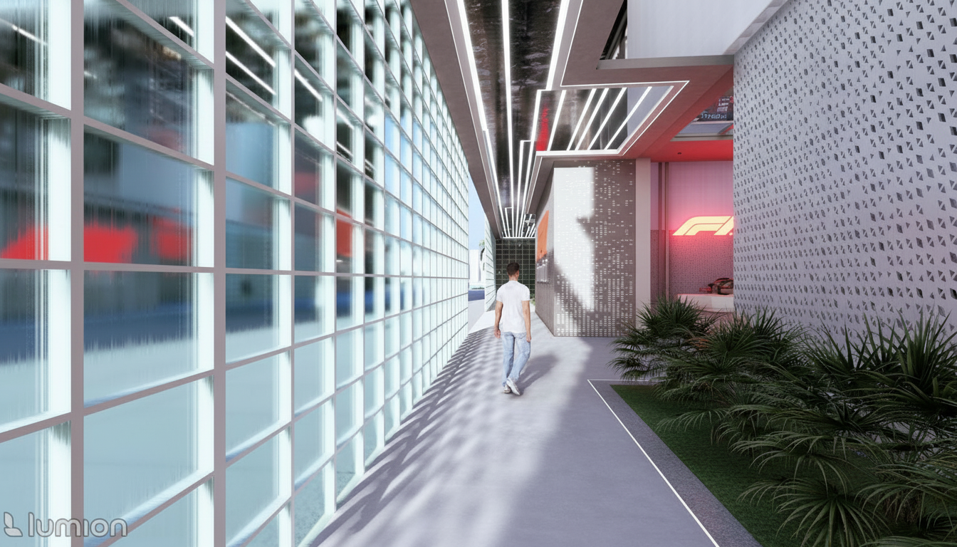 create a night version of this architectural corridor keep all geometry colours materials and reflections unchanged add dramatic linear lights bright led strips running along the skylight edges and strong recessed ground leds tracing the pathway these should project long light streaks and reflections on the floor and glass walls enhance the sense of depth and draw attention toward the f1 exhibit at the end high contrast cinematic elegant