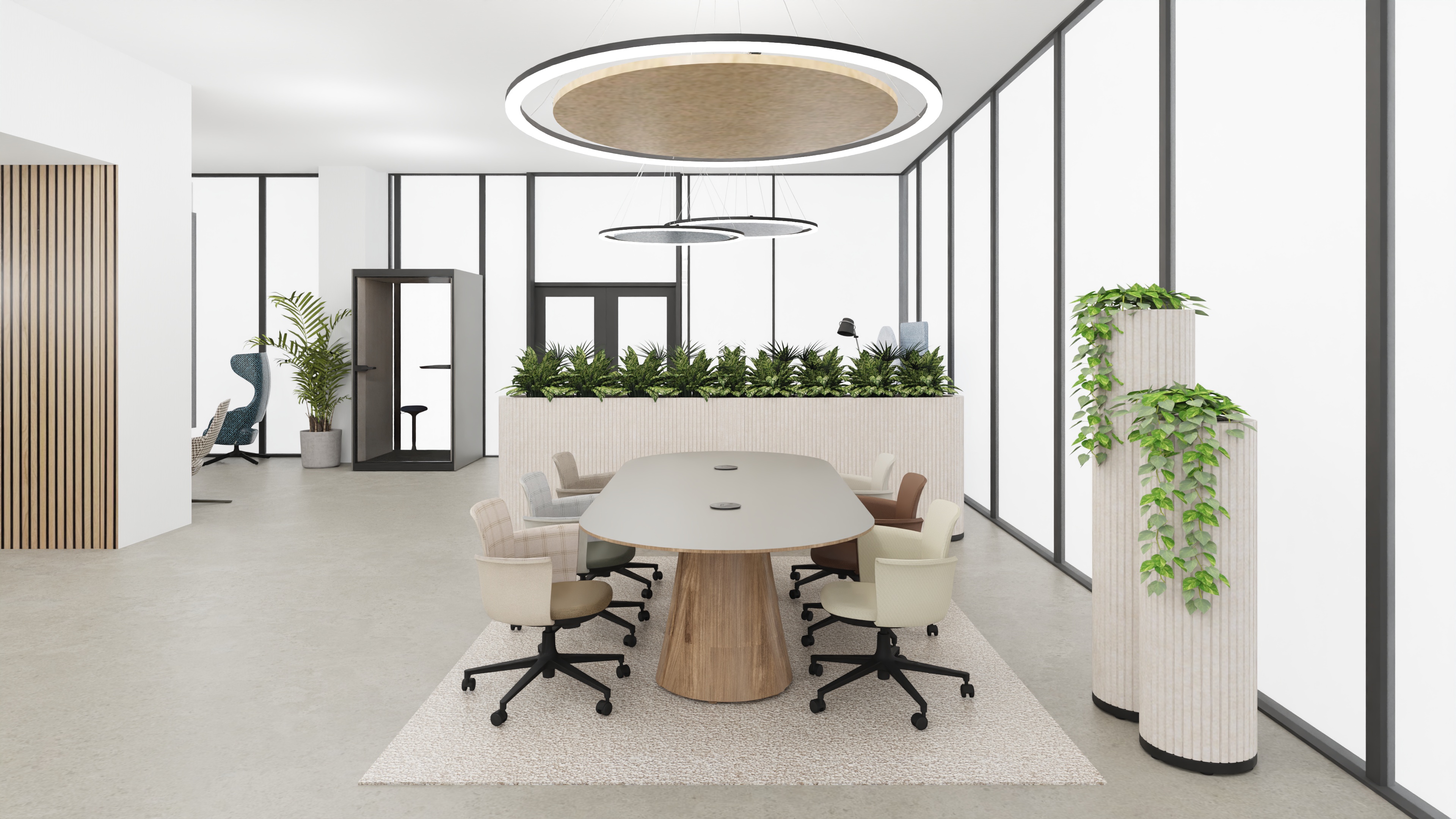 make this look photorealistic with space full of people and a nice street view in the windows