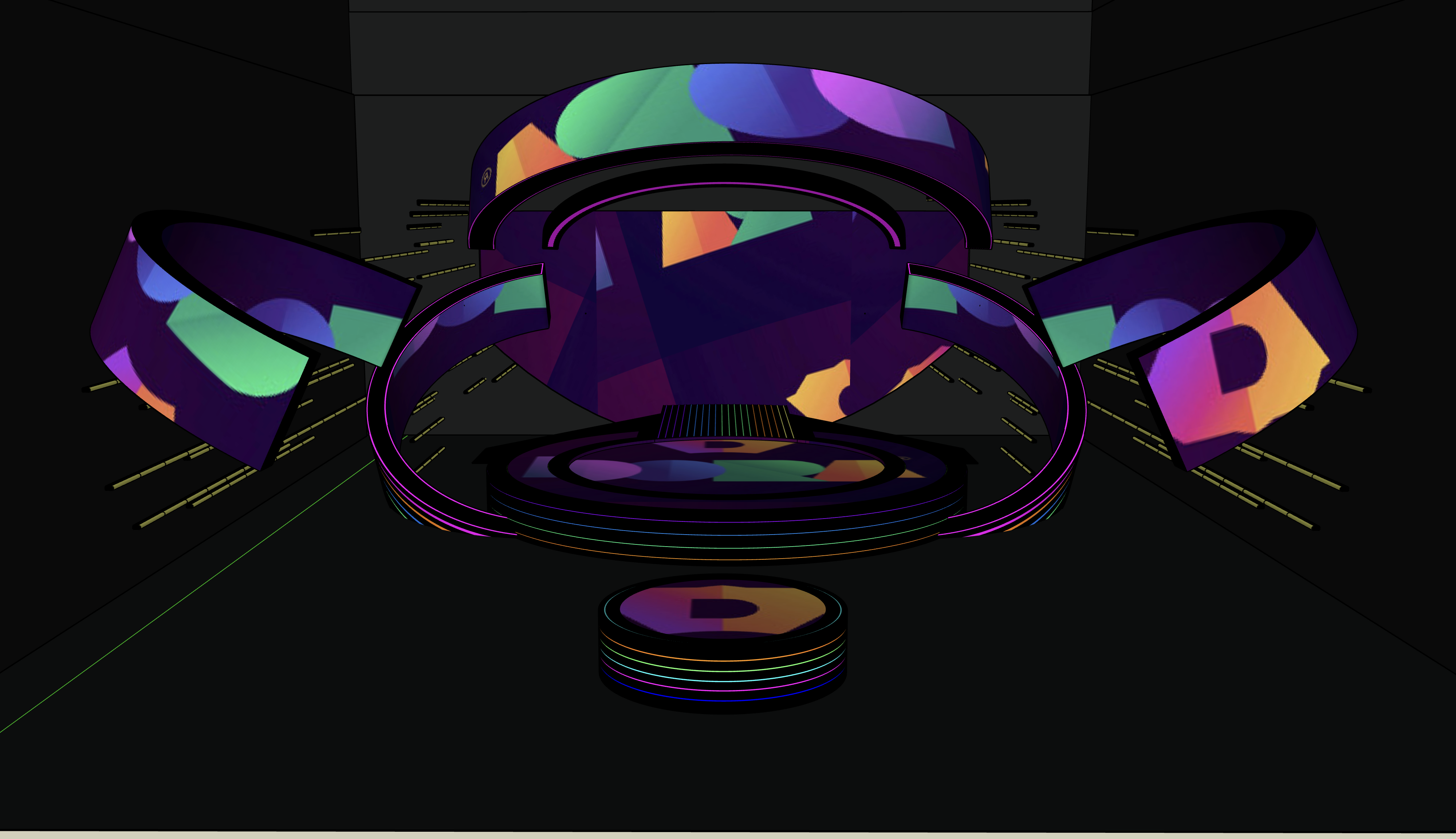make an eurovision style stage render people on the stage haze and light beams people in the audience vibrant colors architecture