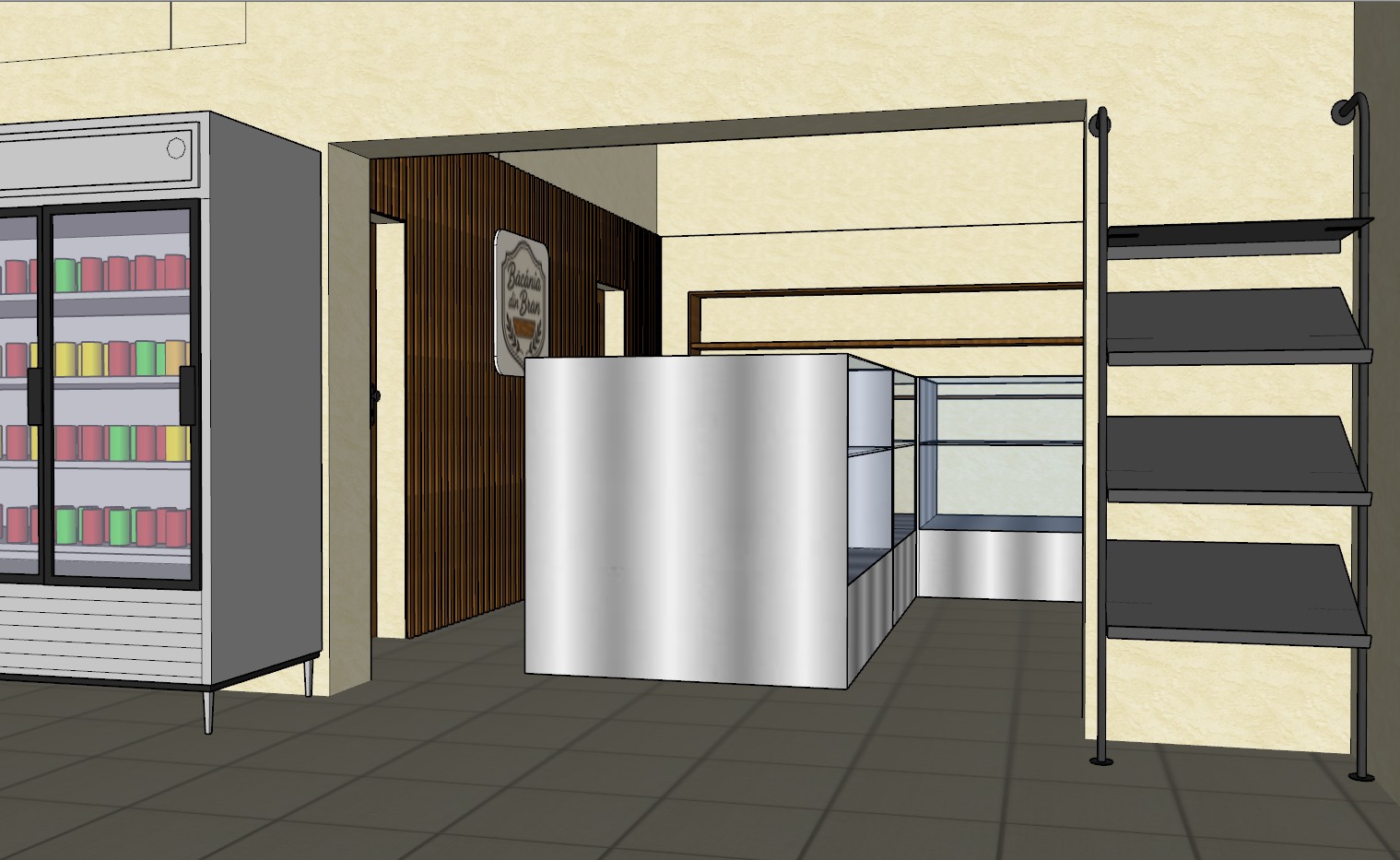 this is a side view picture make it real and add lights and some random meat and lactate products in the glass display place some bread on the wooden shelfs in the back