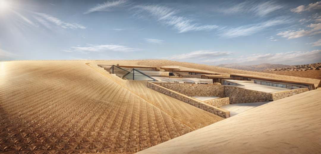 a tranquil luxury wellness pool terrace at night illuminated by soft architectural lighting and a deep blue evening sky the pool features curved stone steps and textured mosaic tiles that catch the ambient glow with two people gently wading in the warm water along the edge plush lounge chairs with light fabric cushions and gold metal frames sit beside small sculptural tables creating an inviting relaxation zone the fa ade includes warm toned wall panels glass doors and a built in shelving and towel station marked with elegant signage reading wellness is the true luxury overhead lush cascading greenery and vibrant blue flowers drape across the structure adding a serene biophilic canopy in the background beyond the terrace the view opens to a panoramic sydney skyline with subtle night time city lights twinkling across the horizon the scene is rendered in a high end lumion style with soft shadows reflective water and a calming resort like mood