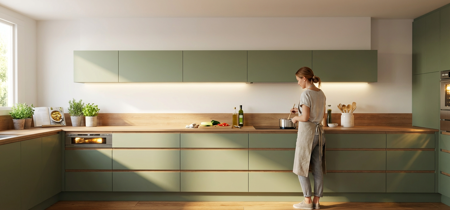 add natural lighting into space add kitchen decor have a lady grabbing a tray out of the oven