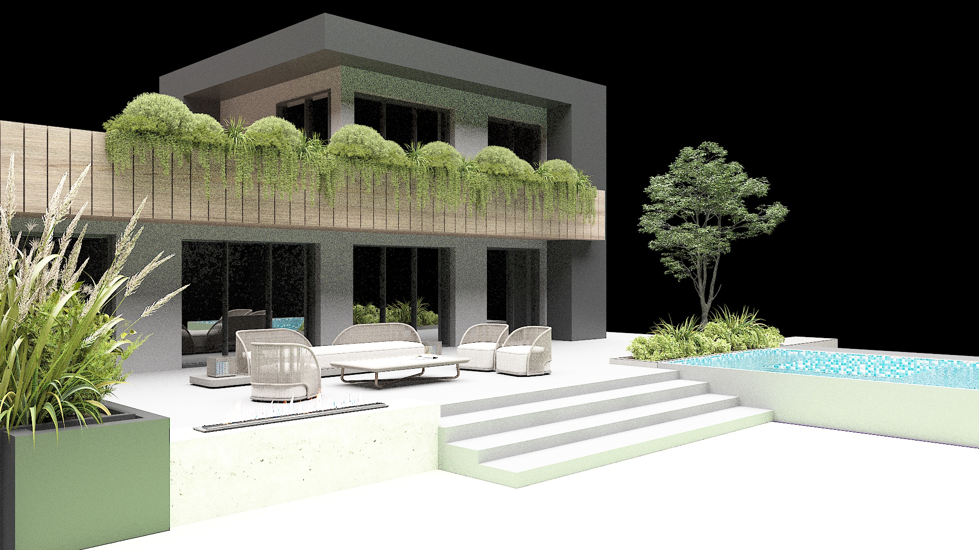 create hyper realistic rendering of this contemporary house with expose concrete light gray as well as gray black element on the facade large glass minimalist windows and put all the wooden elemets in the picture in an inconspicuous wood decor make the grass hyper realistic as well as the grey tiles in the front of the house the water in the pool tp laze gently in the sun and a realistic picture of the water in the poolitself morning hour lightening with soft shadows and realistic reflection do not change elements in the picture and do not add new elements