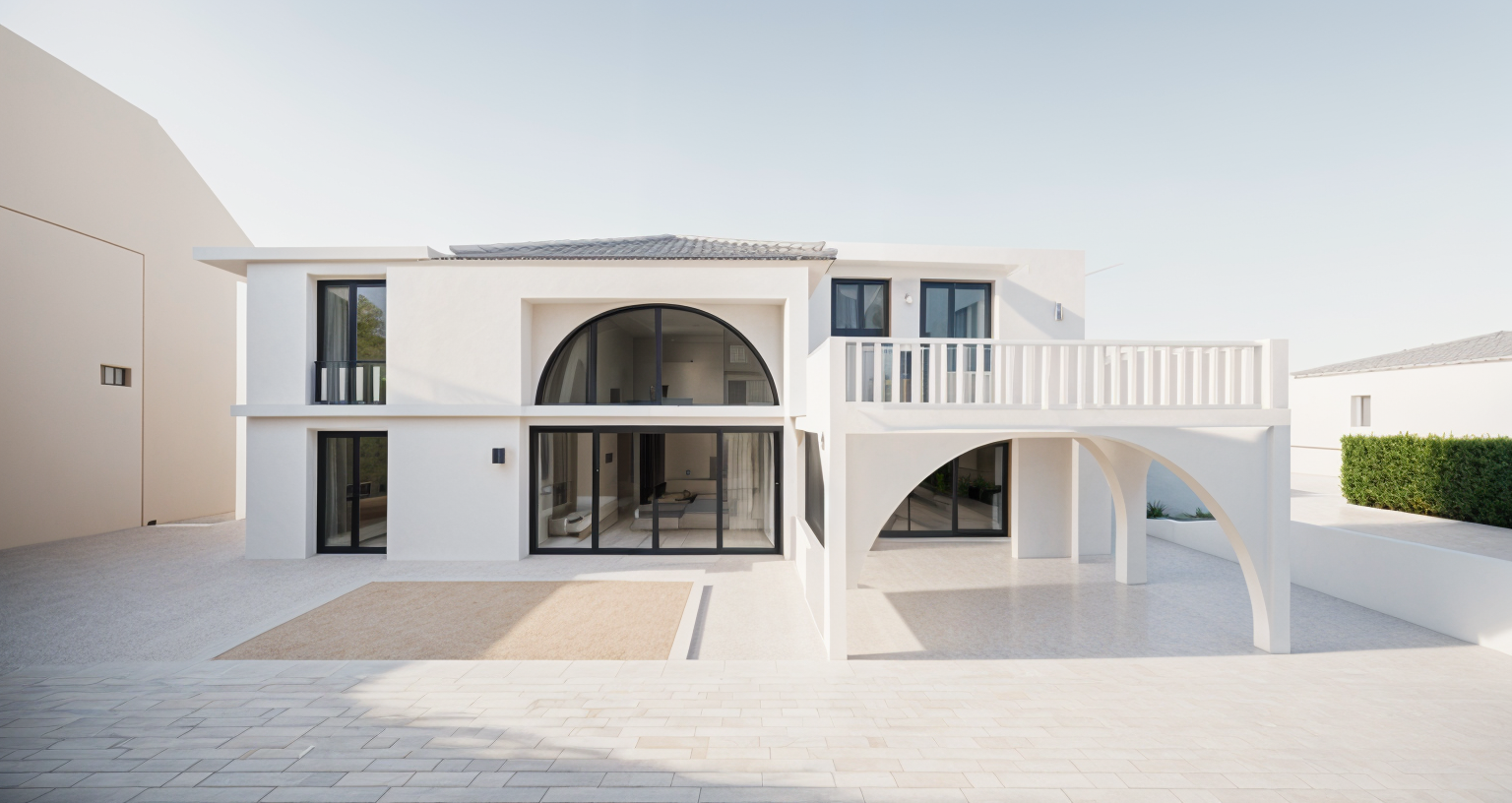 mediterranean revival exterior shot in forest white stone facade add green lanscape with olive trees architecture