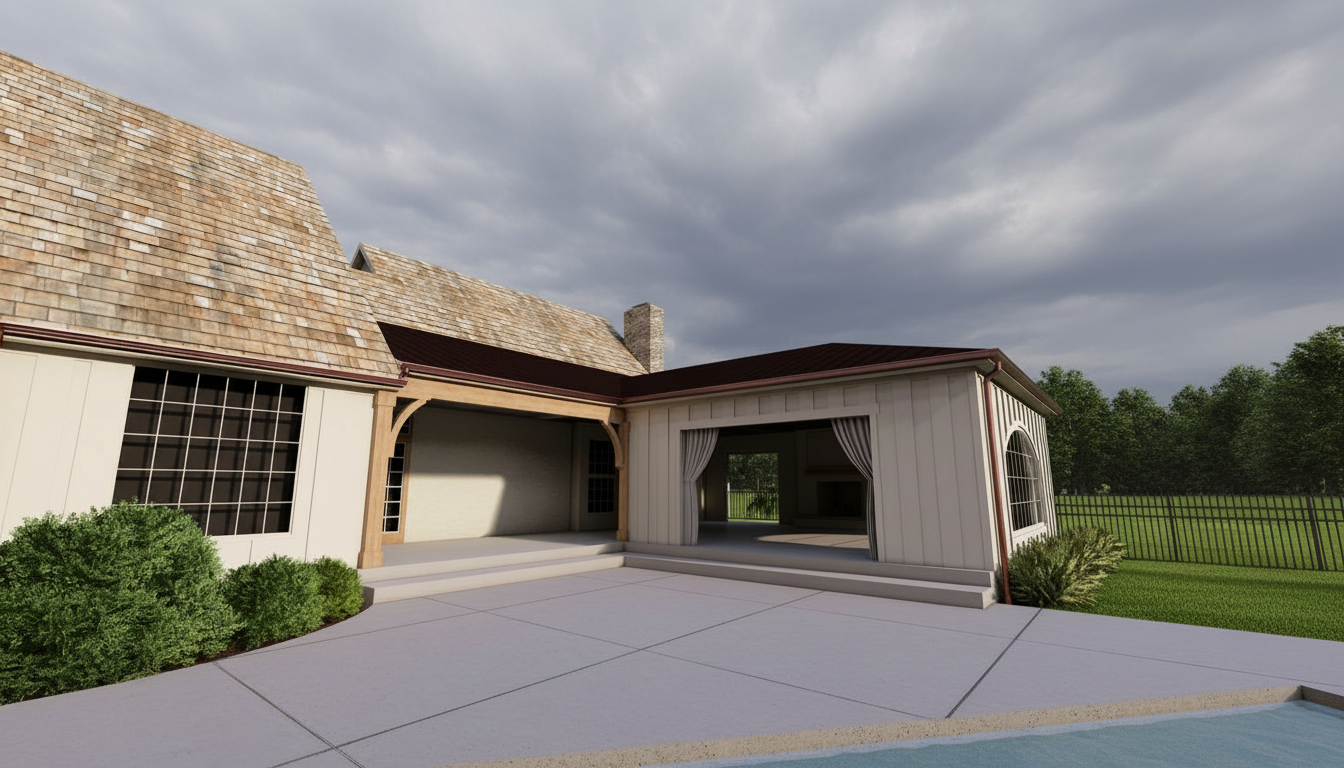 render this bedroom with natural lighting add palm springs scenery to the windows make both windows on the same wall to match elevation add cornice to both windows that matches the drape fabric