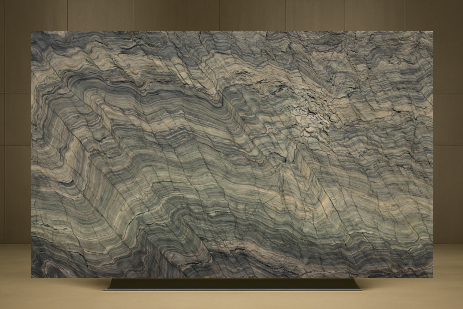 create a bold designer inspired moodboard for this slab of fusion quartzite fusion quartzite has steely blues subtle hints of gray green and pale warm taupe