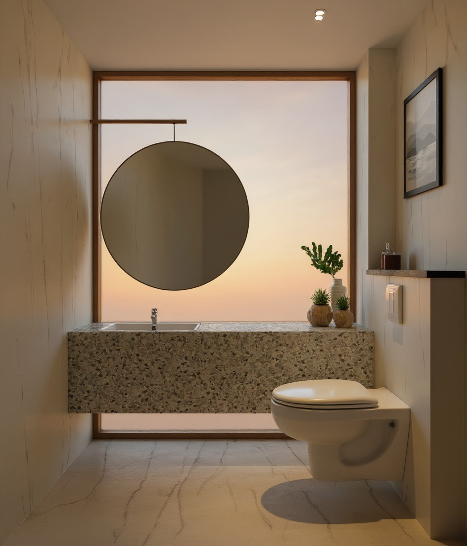 ultra futuristic neo futurism luxury minimalist workspace interior connected to a bedroom suite the space features smooth pure white walls combined with soft beige travertine panels wrapping around gentle curved corners creating a refined futuristic texture contrast a sculptural dark wood partition wall separates the workspace from the adjacent room incorporating a wide horizontal opening that frames warm indirect light and glimpses of parametric gold pendant fixtures beyond a sleek cantilevered desk made of dark wood and black and white veined marble extends seamlessly from the partition forming a floating monolithic workstation surface a high end ergonomic black mesh office chair adds functionality while maintaining the minimalist aesthetic vertical ribbed white wall panels add rhythmic futuristic geometry to the left side of the room the flooring is raw matte concrete grounding the space with industrial luxe texture soft diffused ceiling lighting enhances the clean sculpted surfaces the overall atmosphere is hyper modern elegant and minimal with seamless materials sculptural forms and cinematic neo futuristic lighting rendered in 8k lumion style photorealism