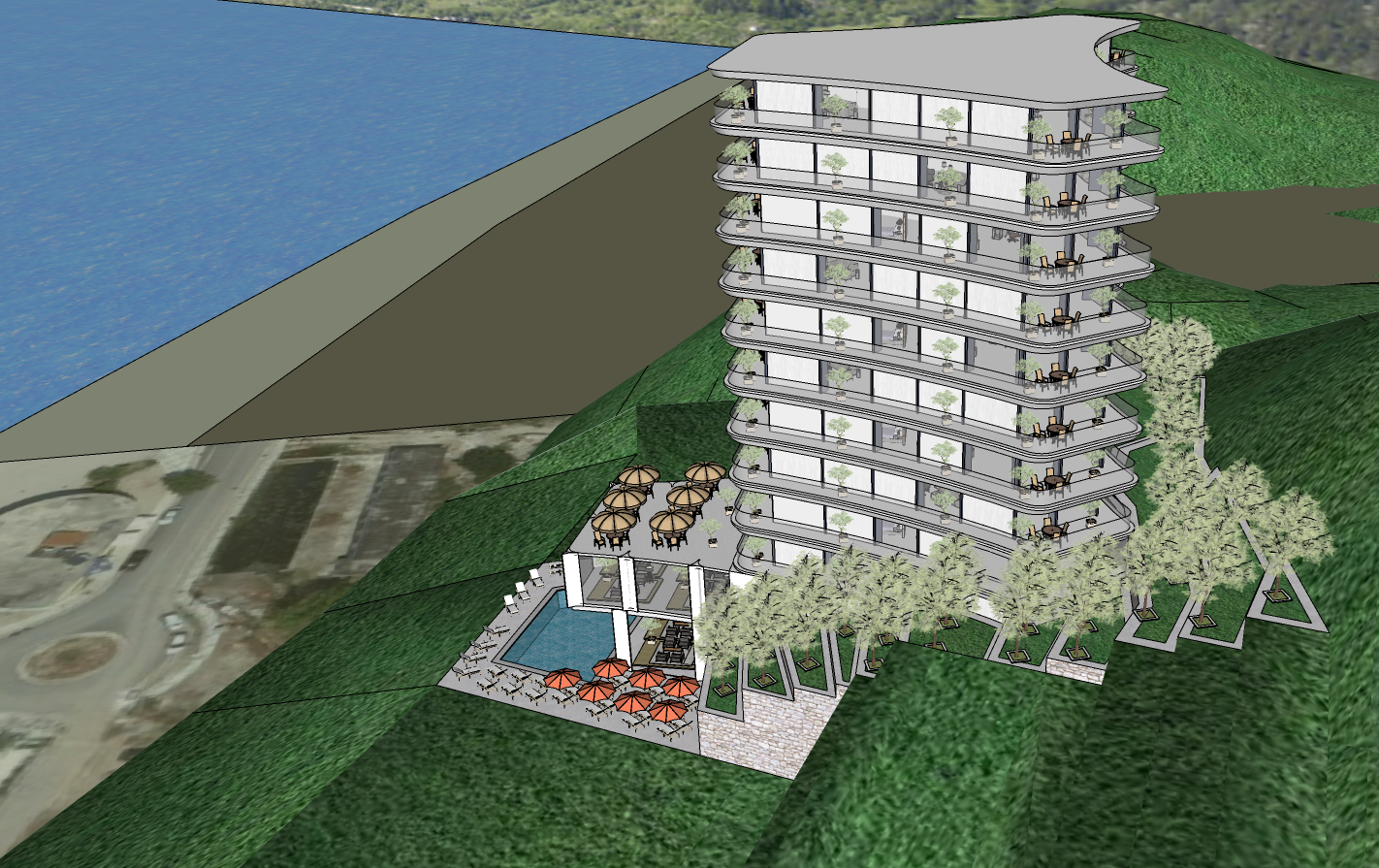 a modern high rise building on a lush green hillside overlooking the ocean the structure is sleek and futuristic with smooth curved lines and white and light gray concrete exterior the balconies are adorned with small potted trees adding a touch of greenery at the base of the building there s a spacious terrace with tables and orange umbrellas the pool is a shimmering deep blue surrounded by elegant lounge chairs the ocean is a tranquil azure blue with gentle waves lapping against the shore the sky is clear creating a serene and refreshing atmosphere perfect for a luxurious getaway there are a few modern low buildings around