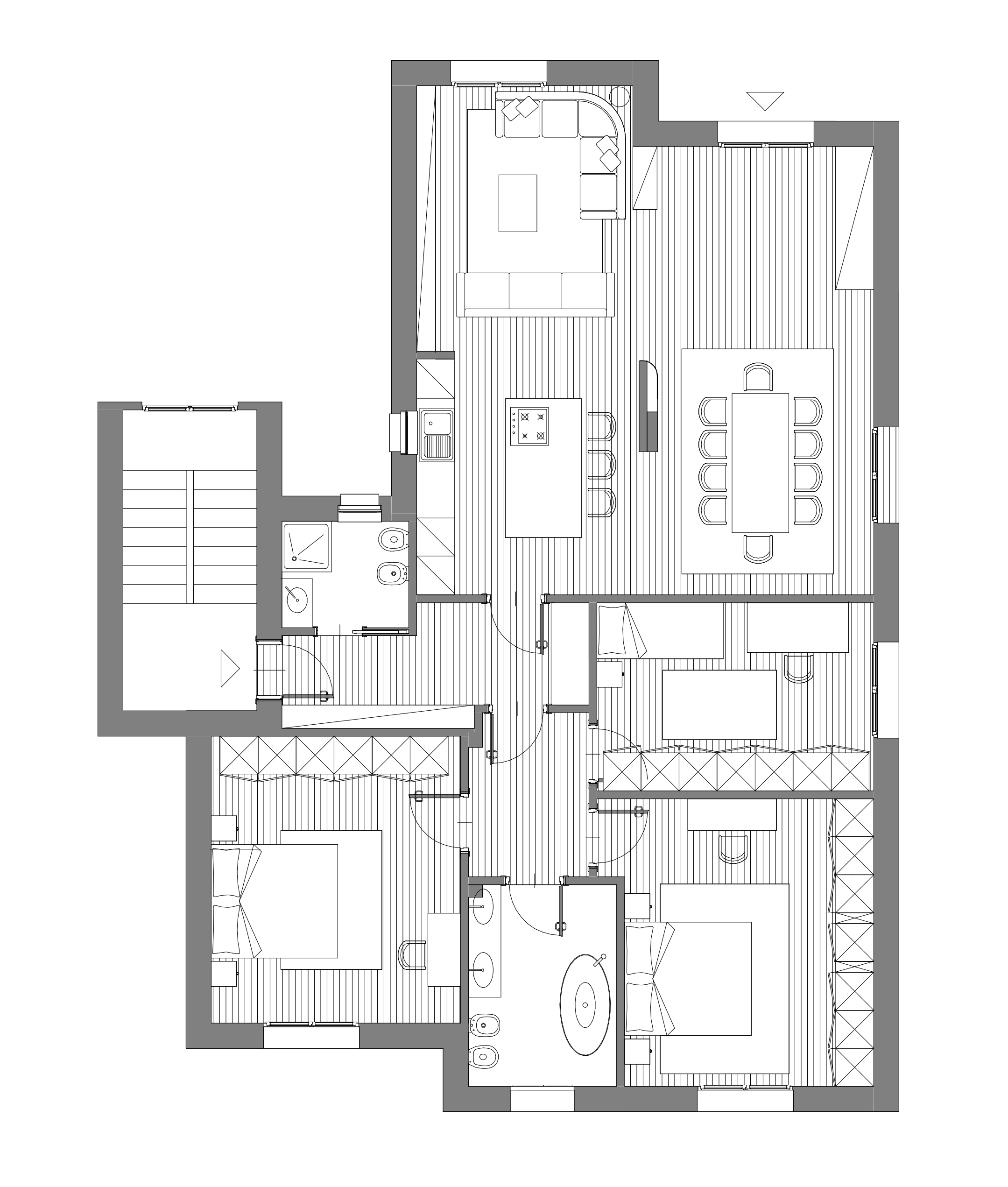 convert this floor plan into a realistic isometric 3d view of a full house show the space from an elevated angle with furniture walls and details visible render a modern and luxurious apartment layout with an open concept design use a soft color palette with light beige for the walls and warm oak wood for the floors the living room features a plush gray sectional sofa with teal and gold accent pillows the dining area showcases a sleek marble table with elegant dark wood chairs the kitchen has a minimalistic design with white cabinetry and stainless steel appliances in the bedrooms opt for soothing lavender tones with plush area rugs and contemporary furniture the bathrooms are accented with white tiles and silver fixtures overall atmosphere calm sophisticated and inviting with plenty of natural light streaming through large windows use the same furniture as shows on the plan do not change the orientation of the floorplan