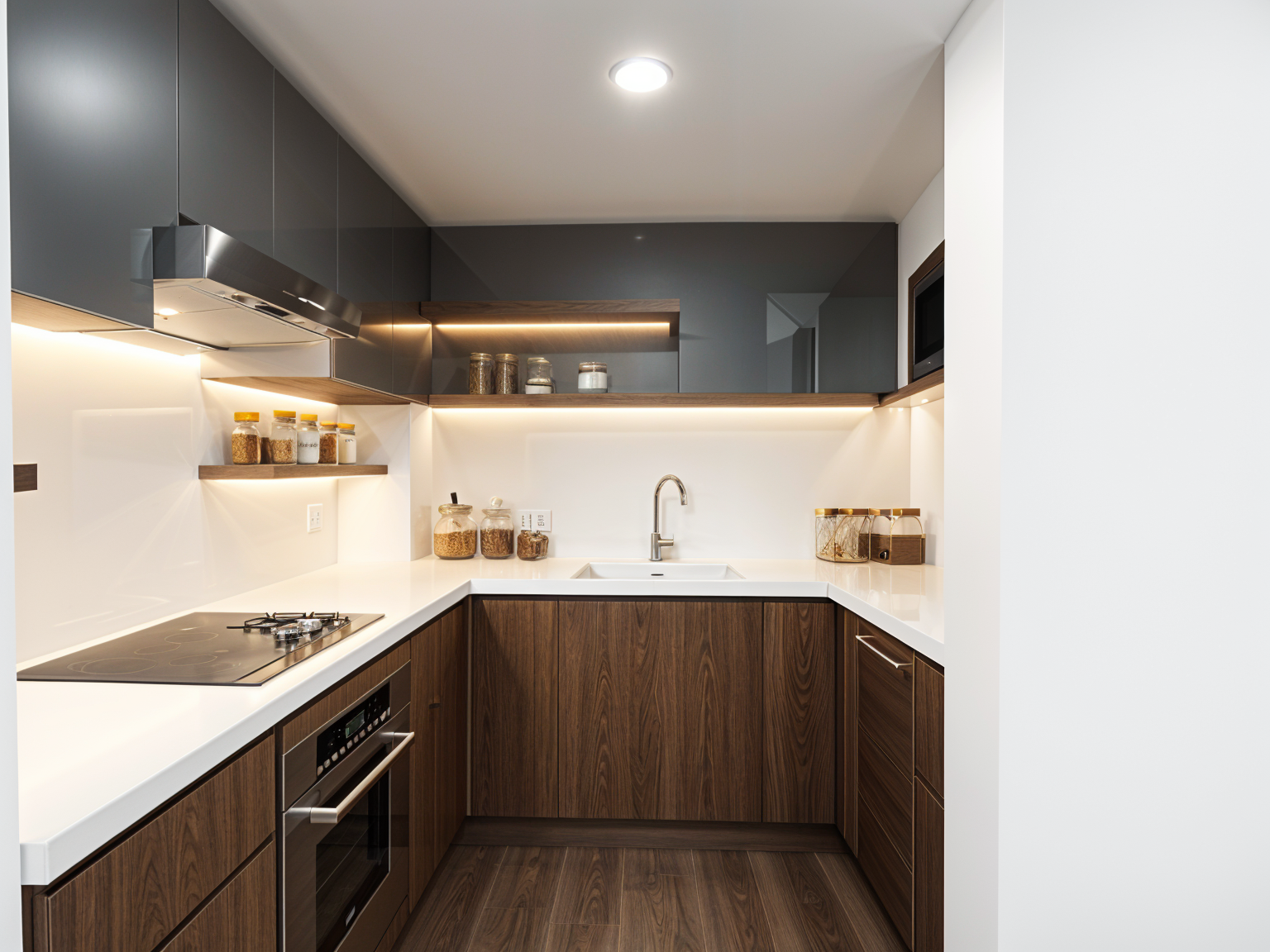 visualization of home fitness do not change any proportion the window frames brown wood with natural light streaming in through the large windows new wall panel with shelves for fitness staff oak matt ceiling stright next to the panel oak creating c shape form of the wall panel put fitness staff on that oak panel wall on the right side put some small kettlebels on lower shelves 2 towels above 2 jogamats rolled on shorter shelves next to the tv hang 1 jumping rope on hang on the right side of the flat tv make ambient light there is soft led lights under the shelves on that wall oak panel and 4 round light on the oak ceiling do not put anything on flor left side or windows