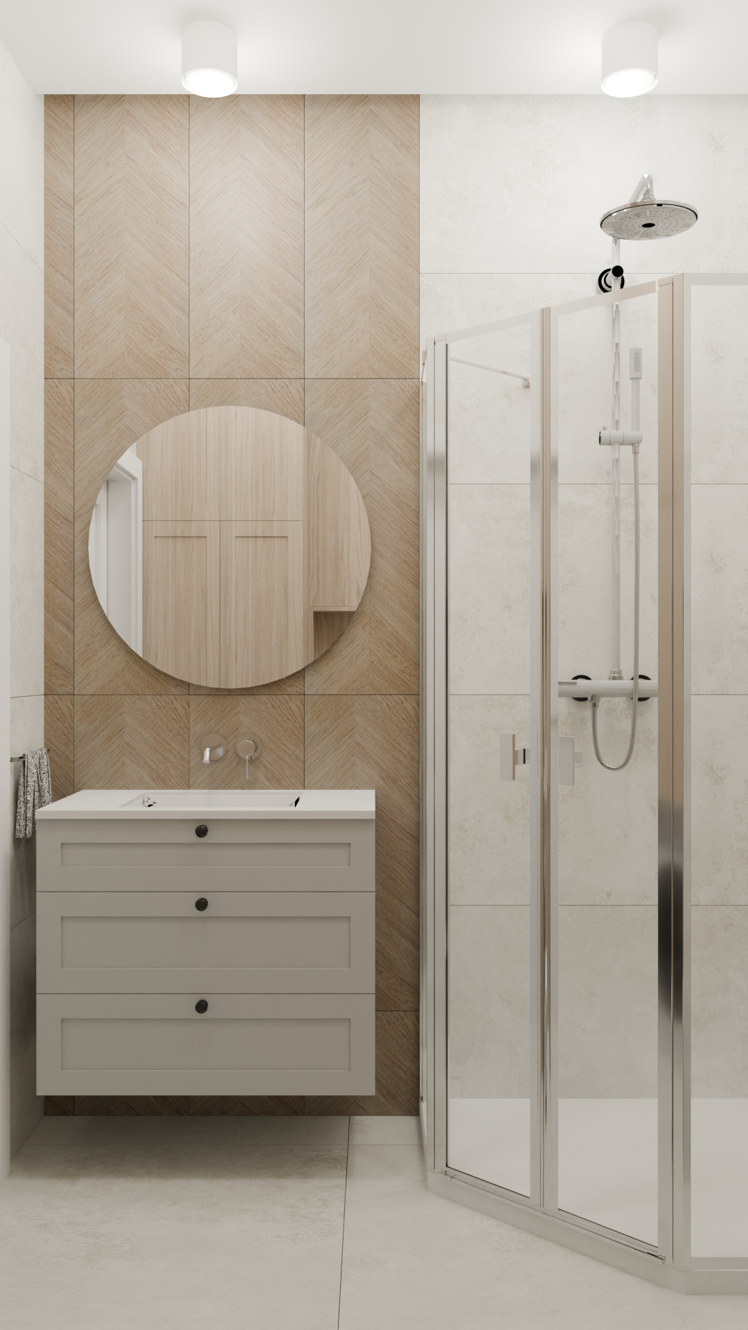 a photorealistic visualization led lighting behind the mirror led lighting in the recess of the suspended ceiling above the washbasin without a side led strip the sink is white the towel is white the rainfall showerhead is chrome the wood look cabinet fronts reflected in the mirror have a frame detail matching the one visible