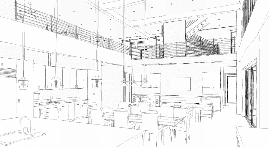 exterior shot take the previous render attached in the moodboard box and generate an image from the sketch this is the same room so all style trim needs to match