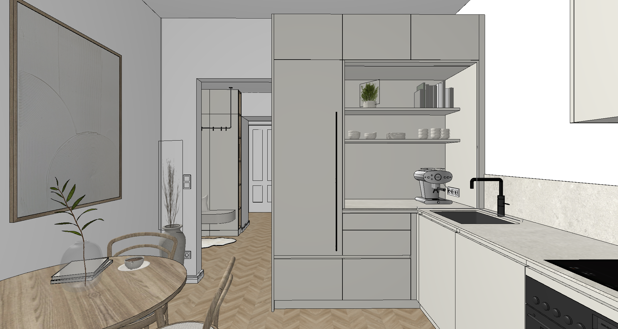 altbauwohnung in salzburg warme lichtstimmung sonnenlicht von au en einfallend fussboden heller eiche w nde und innent ren in wei k che in hellem beige mit beleuchtung in der k chennische waschbecken und armatur in schwarz arbeitsplatte in hellergrauer warmer steinoptik k chendekoration